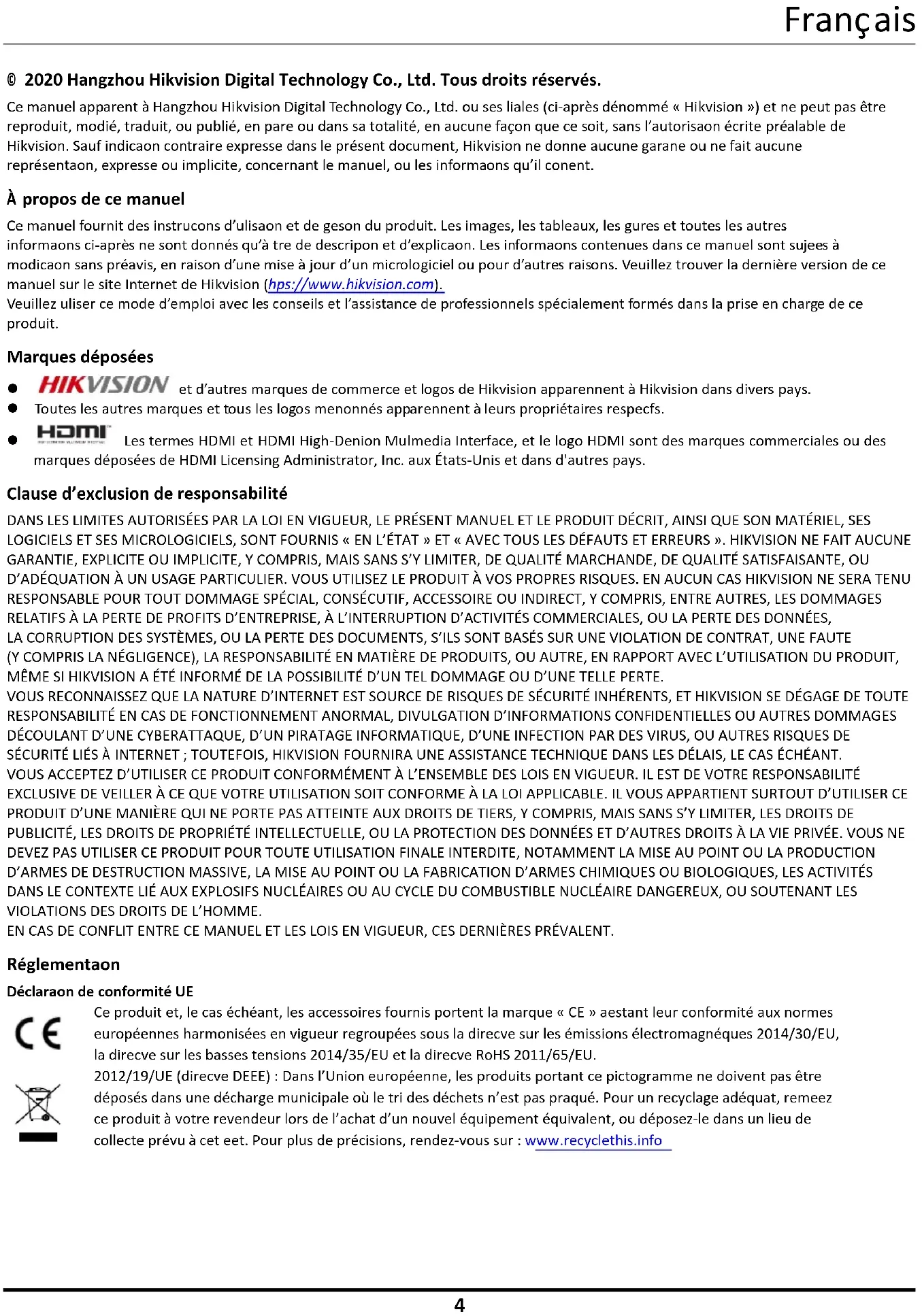 © 2020 Hangzhou Hikvision Digital Technology Co., Ltd. Tous droits réservés. Ce manuel appartient à Hangzhou Hikvision Digital Technology Co., Ltd. ou ses filiales (ci-après dénommé « Hikvision ») et ne peut pas être reproduit, modifié, traduit, ou publié, en partie ou dans sa totalité, en aucune façon que ce soit, sans l’autorisation écrite préalable de Hikvision. Sauf indication contraire expresse dans le présent document, Hikvision ne donne aucune garantie ou ne fait aucune représentation, expresse ou implicite, concernant le manuel, ou les informations qu’il contient. À propos de ce manuel Ce manuel fournit des instructions d’utilisation et de gestion du produit. Les images, les tableaux, les figures et toutes les autres informations ci-après ne sont donnés qu’à titre de description et d’explication. Les informations contenues dans ce manuel sont sujettes à modification sans préavis, en raison d’une mise à jour d’un micrologiciel ou pour d’autres raisons. Veuillez trouver la dernière version de ce manuel sur le site Internet de Hikvision (https://www .hikvision.com). Veuillez utiliser ce mode d’emploi avec les conseils et l’assistance de professionnels spécialement formés dans la prise en charge de ce produit. Marques déposées et d’autres marques de commerce et logos de Hikvision appartiennent à Hikvision dans divers pays. Toutes les autres marques et tous les logos mentionnés appartiennent à leurs propriétaires respectifs. Les termes HDMI et HDMI High-Definition Multimedia Interface, et le logo HDMI sont des marques commerciales ou des marques déposées de HDMI Licensing Administrator, Inc. aux États-Unis et dans d'autres pays. Clause d’exclusion de responsabilité DANS LES LIMITES AUTORISÉES PAR LA LOI EN VIGUEUR, LE PRÉSENT MANUEL ET LE PRODUIT DÉCRIT, AINSI QUE SON MATÉRIEL, SES LOGICIELS ET SES MICROLOGICIELS, SONT FOURNIS « EN L’ÉTAT » ET « AVEC TOUS LES DÉFAUTS ET ERREURS ». HIKVISION NE FAIT AUCUNE GARANTIE, EXPLICITE OU IMPLICITE, Y COMPRIS, MAIS SANS S’Y LIMITER, DE QUALITÉ MARCHANDE, DE QUALITÉ SATISFAISANTE, OU D’ADÉQUATION À UN USAGE PARTICULIER. VOUS UTILISEZ LE PRODUIT À VOS PROPRES RISQUES. EN AUCUN CAS HIKVISION NE SERA TENU RESPONSABLE POUR TOUT DOMMAGE SPÉCIAL, CONSÉCUTIF, ACCESSOIRE OU INDIRECT, Y COMPRIS, ENTRE AUTRES, LES DOMMAGES RELATIFS À LA PERTE DE PROFITS D’ENTREPRISE, À L’INTERRUPTION D’ACTIVITÉS COMMERCIALES, OU LA PERTE DES DONNÉES, LA CORRUPTION DES SYSTÈMES, OU LA PERTE DES DOCUMENTS, S’ILS SONT BASÉS SUR UNE VIOLATION DE CONTRAT, UNE FAUTE (Y COMPRIS LA NÉGLIGENCE), LA RESPONSABILITÉ EN MATIÈRE DE PRODUITS, OU AUTRE, EN RAPPORT AVEC L’UTILISATION DU PRODUIT, MÊME SI HIKVISION A ÉTÉ INFORMÉ DE LA POSSIBILITÉ D’UN TEL DOMMAGE OU D’UNE TELLE PERTE. VOUS RECONNAISSEZ QUE LA NATURE D’INTERNET EST SOURCE DE RISQUES DE SÉCURITÉ INHÉRENTS, ET HIKVISION SE DÉGAGE DE TOUTE RESPONSABILITÉ EN CAS DE FONCTIONNEMENT ANORMAL, DIVULGATION D’INFORMATIONS CONFIDENTIELLES OU AUTRES DOMMAGES DÉCOULANT D’UNE CYBERATTAQUE, D’UN PIRATAGE INFORMATIQUE, D’UNE INFECTION PAR DES VIRUS, OU AUTRES RISQUES DE SÉCURITÉ LIÉS À INTERNET ; TOUTEFOIS, HIKVISION FOURNIRA UNE ASSISTANCE TECHNIQUE DANS LES DÉLAIS, LE CAS ÉCHÉANT. VOUS ACCEPTEZ D’UTILISER CE PRODUIT CONFORMÉMENT À L’ENSEMBLE DES LOIS EN VIGUEUR. IL EST DE VOTRE RESPONSABILITÉ EXCLUSIVE DE VEILLER À CE QUE VOTRE UTILISATION SOIT CONFORME À LA LOI APPLICABLE. IL VOUS APPARTIENT SURTOUT D’UTILISER CE PRODUIT D’UNE MANIÈRE QUI NE PORTE PAS ATTEINTE AUX DROITS DE TIERS, Y COMPRIS, MAIS SANS S’Y LIMITER, LES DROITS DE PUBLICITÉ, LES DROITS DE PROPRIÉTÉ INTELLECTUELLE, OU LA PROTECTION DES DONNÉES ET D’AUTRES DROITS À LA VIE PRIVÉE. VOUS NE DEVEZ PAS UTILISER CE PRODUIT POUR TOUTE UTILISATION FINALE INTERDITE, NOTAMMENT LA MISE AU POINT OU LA PRODUCTION D’ARMES DE DESTRUCTION MASSIVE, LA MISE AU POINT OU LA FABRICATION D’ARMES CHIMIQUES OU BIOLOGIQUES, LES ACTIVITÉS DANS LE CONTEXTE LIÉ AUX EXPLOSIFS NUCLÉAIRES OU AU CYCLE DU COMBUSTIBLE NUCLÉAIRE DANGEREUX, OU SOUTENANT LES VIOLATIONS DES DROITS DE L’HOMME. EN CAS DE CONFLIT ENTRE CE MANUEL ET LES LOIS EN VIGUEUR, CES DERNIÈRES PRÉVALENT. Réglementation Déclaration de conformité UE