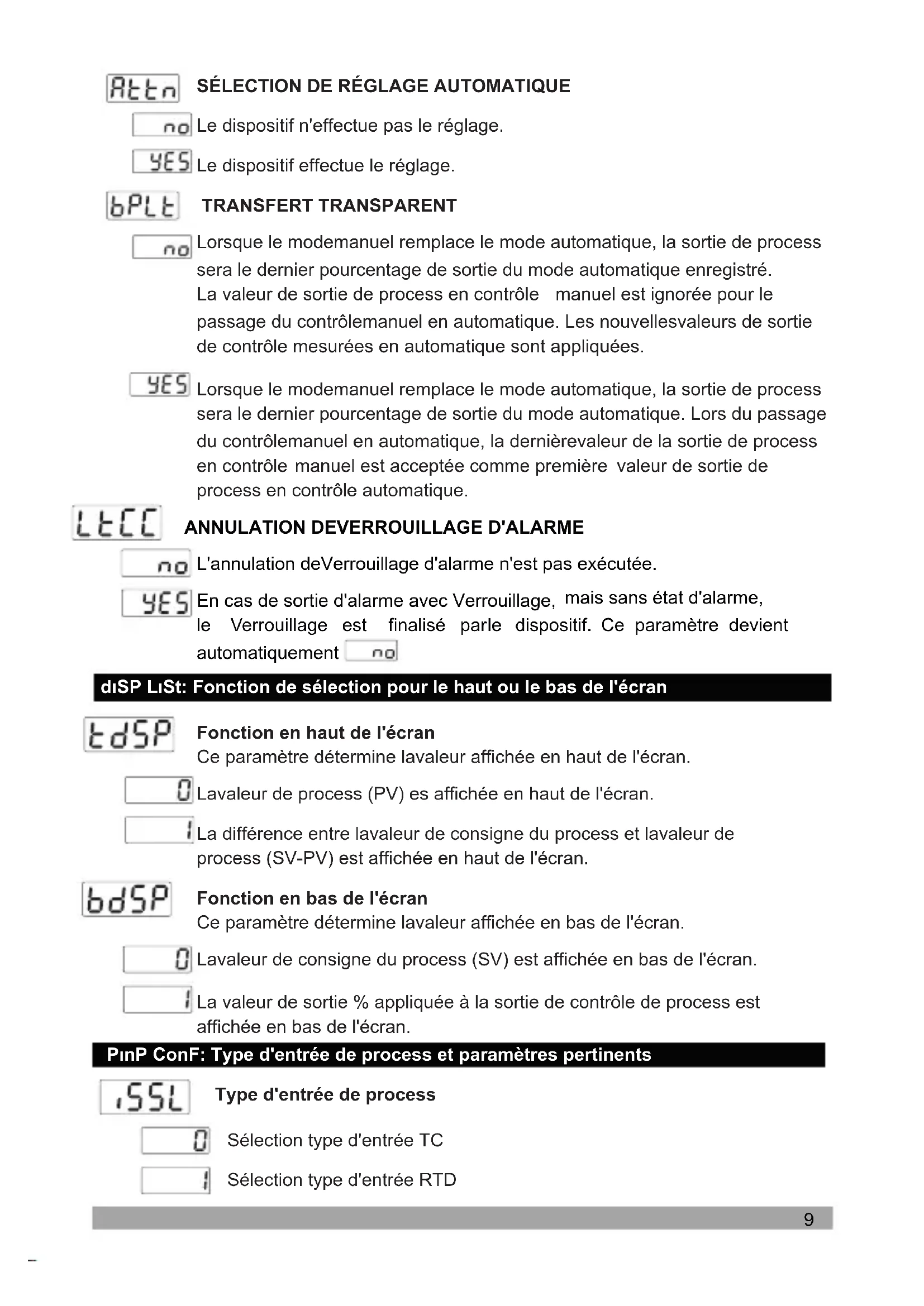 En cas de sortie d'alarme avec Verrouillage, mais sans état d'alarme, le Verrouillage est finalisé par le dispositif. Ce paramètre devient automatiquement Lorsque le modemanuel remplace le mode automatique, la sortie de process sera le dernier pourcentage de sortie du mode automatique. Lors du passage du contrôlemanuel en automatique, la dernièrevaleur de la sortie de process en contrôle manuel est acceptée comme première valeur de sortie de process en contrôle automatique. L'annulation deVerrouillage d'alarme n'est pas exécutée. dıSP LıSt: Fonction de sélection pour le haut ou le bas de l'écran Fonction en haut de l'écran Ce paramètre détermine lavaleur affichée en haut de l'écran. La différence entre lavaleur de consigne du process et lavaleur de process (SV-PV) est affichée en haut de l'écran. Fonction en bas de l'écran Ce paramètre détermine lavaleur affichée en bas de l'écran. Lavaleur de consigne du process (SV) est affichée en bas de l'écran. La valeur de sortie % appliquée à la sortie de contrôle de process est affichée en bas de l'écran. PınP ConF: Type d'entrée de process et paramètres pertinents Type d'entrée de process Sélection type d'entrée TC Sélection type d'entrée RTD Lavaleur de process (PV) es affichée en haut de l'écran. 9Sélection type d'entrée Courant/ Tension Z Sélection d'entrée TC Ce paramètre est activé si le type d'entrée TC est sélectionné. L (-100°C ; 850°C) or (-148°F ; 1562°F) L (-100,0°C ; 850,0°C) or (-148,0°F ; 999,9°F) J (-200°C ; 900°C) or (-328°F ; 1652°F) J (-199,9°C ; 900,0°C) ou (-199,9°F ; 999,9°F) K (-200°C ; 1300°C) ou (-328°F ; 2372°F) K (-199,9°C ; 999,9°C) ou (-199,9°F ; 999,9°F) R (0°C ; 1700°C) ou (32°F ; 3092°F) R (0,0°C ; 999,9°C) ou (32,0°F ; 999,9°F) S (0°C ; 1700°C) ou (32°F ; 3092°F) S (0,0°C ; 999,9°C) ou (32,0°F ; 999,9°F) T (-200°C ; 400°C) ou (-328°F ; 752°F) T (-199,9°C ; 400,0°C) ou (-199,9°F ; 752,0°F) B (44°C ; 1800°C) ou (111°F ; 3272°F) B (44,0°C ; 999,9°C) ou (111,0°F ; 999,9°F) E (-150°C ; 700°C) ou (-238°F ; 1292°F) E (-150,0°C ; 700,0°C) ou (-199,9°F ; 999,9°F) N (-200°C ; 1300°C) ou (-328°F ; 2372°F) N (-199,9°C ; 999,9°C) ou (-199,9°F ; 999,9°F) C (0°C ; 2300°C) ou (32°F ; 3261°F) C (0,0°C ; 999,9°C) ou (32,0°F ; 999,9°F) Sélection d'entrée RTD Ce paramètre est activé si l'entrée RTD est sélectionnée. PT-100 (-200°C ; 650°C) ou (-328°F ; 1202°F) PT-100 (-199,9°C ; 650,0°C) ou (-199,9°F ; 999,9°F)