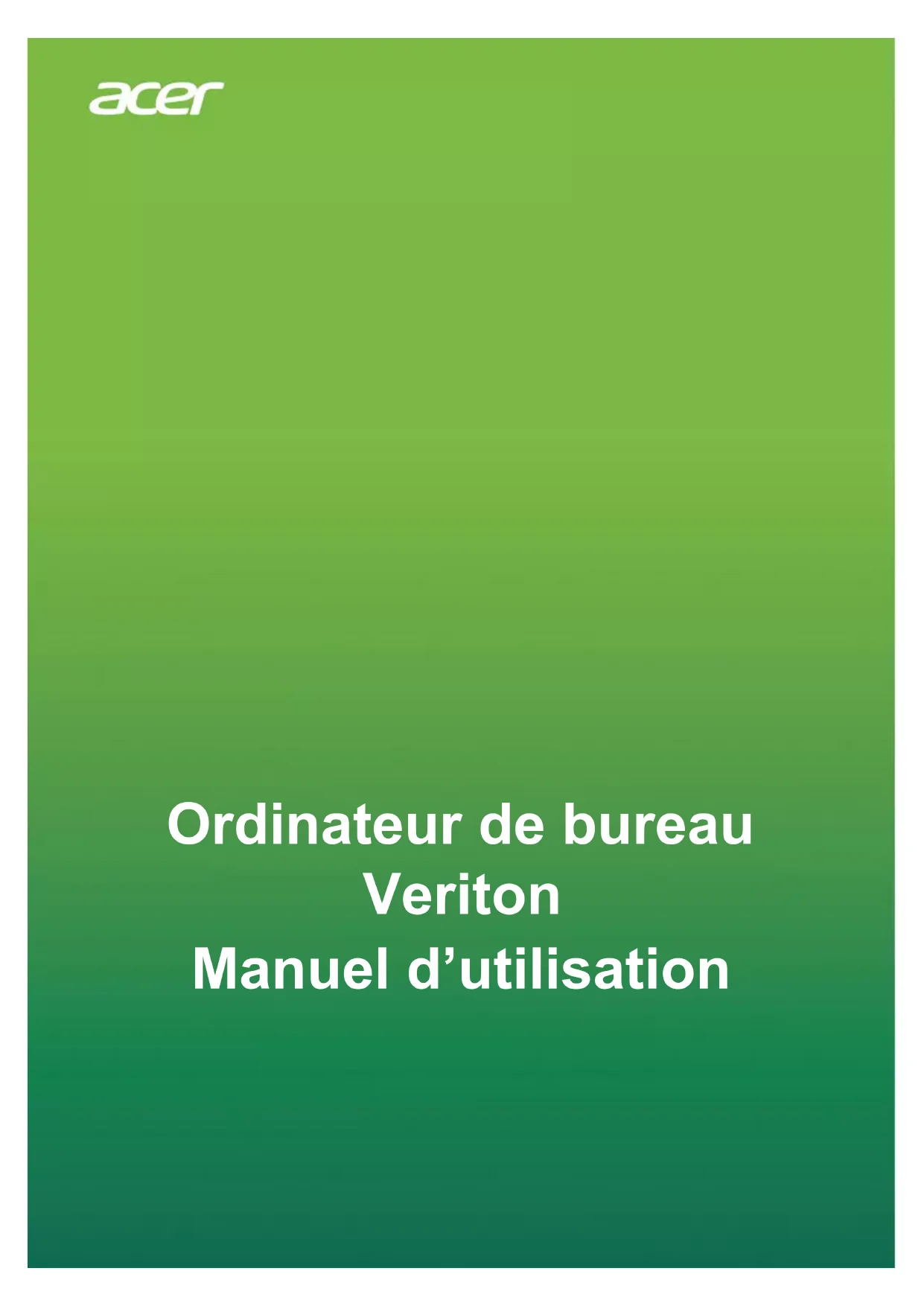 Ordinateur de bureau Veriton Manuel d’utilisation2 - © 2021. Tous droits réservés. Ordinateur de bureau Veriton Couvre : Modèles tour Cette révision : 12/2021 Enregistrer votre produit Acer Si votre nouvel appareil fonctionne sous le système d’exploitation Windows, il est possible que votre produit ait été enregistré automatiquement lors du démarrage de votre appareil avec le système d’exploitation Windows. Connectez-vous à l’adresse www.acer.com/myproducts avec l’adresse e-mail que vous avez enregistrée pour le système d’exploitation Windows afin de consulter votre fiche produit. (Réinitialisez votre mot de passe si vous ne le connaissez pas.) Si la fiche n’est pas trouvée, veuillez suivre les étapes ci-dessous pour vous inscrire. 1.Assurez-vous d'être connecté à Internet. 2.Allez à www.acer.com/register-product. 3.Connectez-vous ou inscrivez-vous pour obtenir Acer ID. 4.Entrez le N/S ou le SNID de votre appareil pour l’enregistrer. Important Ce manuel contient des informations propriétaires qui sont protégées par les lois sur le copyright. Les informations contenues dans ce manuel peuvent être modifiées sans préavis. Certaines fonctionnalités décrites dans ce manuel peuvent ne pas être prises en charge en fonction de la version du système d’exploitation. Les images fournies ici sont pour référence seulement et peuvent contenir des informations ou des fonctionnalités qui ne s’appliquent pas à votre ordinateur. Le Groupe Acer ne peut être tenu responsable des erreurs ou omissions techniques ou éditoriales contenues dans ce manuel. Numéro de modèle : ____________________________ Numéro de série : ______________________________ Date d’achat : _________________________________ Lieu d’achat : __________________________________ Les termes HDMI et High-Definition Multimedia Interface ainsi que le logo HDMI sont des marques commerciales ou des marques déposées de HDMI Licensing Administrator, Inc. aux États-Unis et dans d’autres pays.Table des matières - 3