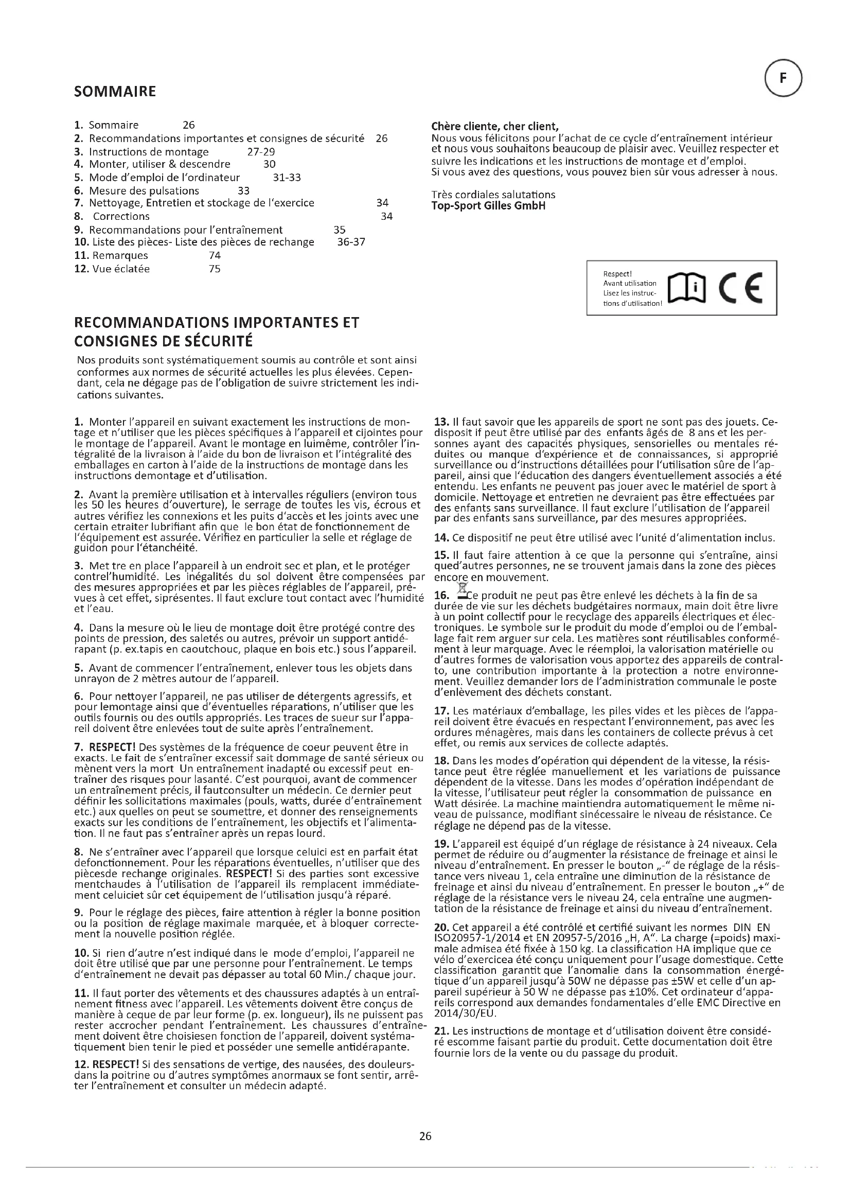 Chère cliente, cher client, Nous vous félicitons pour l’achat de ce cycle d’entraînement intérieur et nous vous souhaitons beaucoup de plaisir avec. Veuillez respecter et suivre les indicaons et les instrucons de montage et d’emploi. Si vous avez des quesons, vous pouvez bien sûr vous adresser à nous. Très cordiales salutaons Top-Sport Gilles GmbH Nos produits sont systémaquement soumis au contrôle et sont ainsi conformes aux normes de sécurité actuelles les plus élevées. Cepen- dant, cela ne dégage pas de l’obligaon de suivre strictement les indi- caons suivantes.