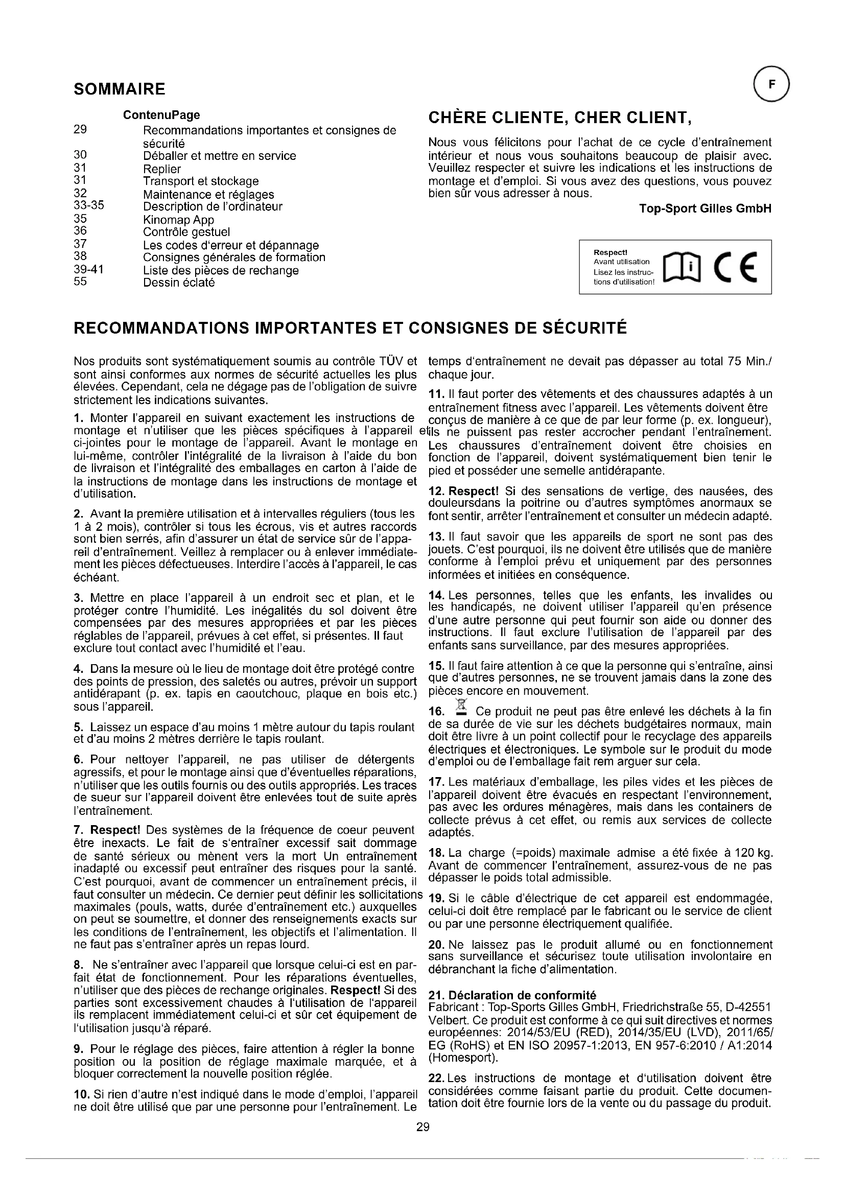 SOMMAIRE CHÈRE CLIENTE, CHER CLIENT, Nous vous félicitons pour l’achat de ce cycle d’entraînement intérieur et nous vous souhaitons beaucoup de plaisir avec. Veuillez respecter et suivre les indications et les instructions de montage et d’emploi. Si vous avez des questions, vous pouvez bien sûr vous adresser à nous. Top-Sport Gilles GmbH ContenuPage Respect! Avant utilisation Lisez les instruc- tions d’utilisation! RECOMMANDATIONS IMPORTANTES ET CONSIGNES DE SÉCURITÉ Nos produits sont systématiquement soumis au contrôle TÜV et sont ainsi conformes aux normes de sécurité actuelles les plus élevées. Cependant, cela ne dégage pas de l’obligation de suivre strictement les indications suivantes.