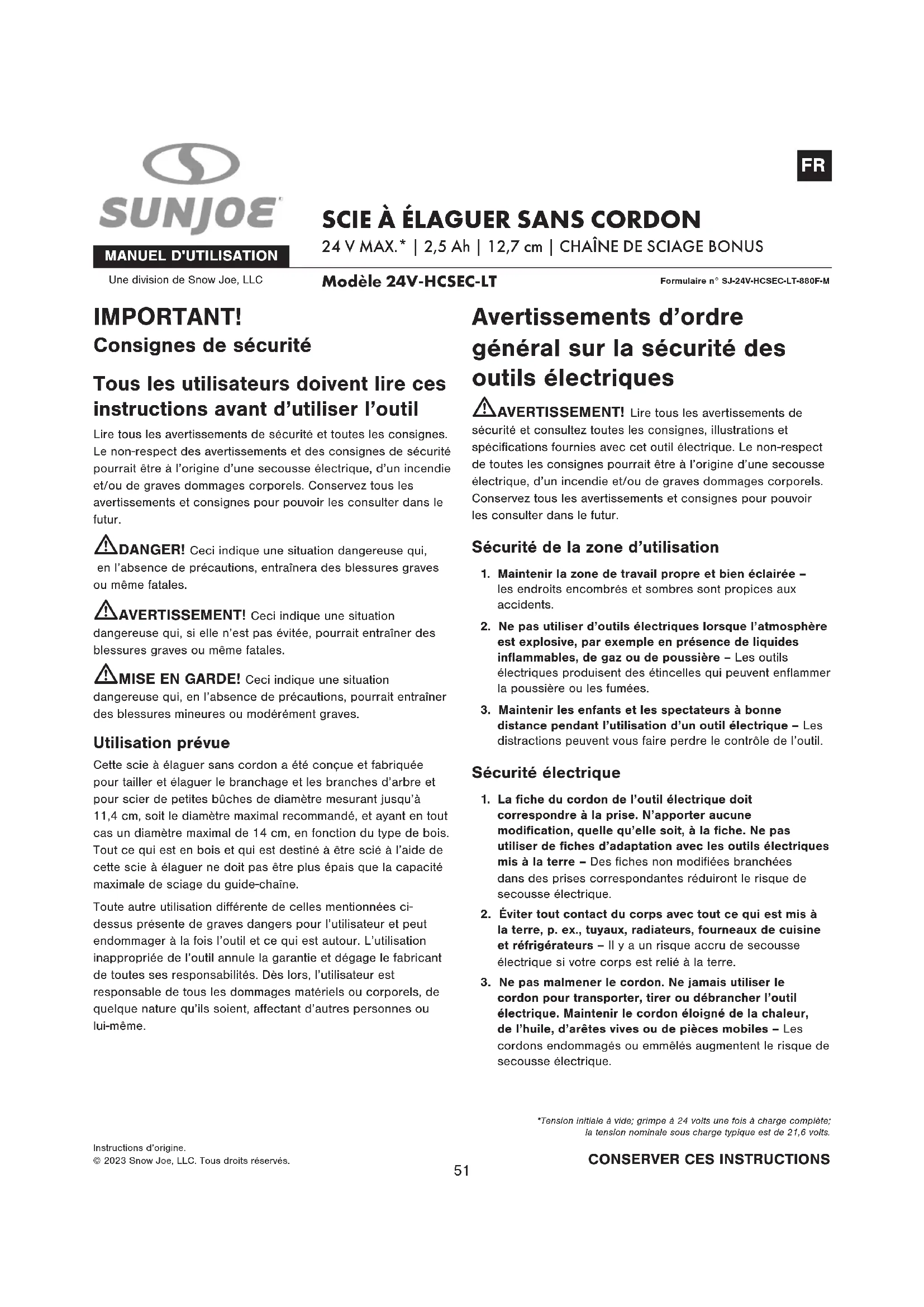 24V-HCSEC-LT - Scie Sun Joe - Notice d'utilisation et mode d'emploi gratuit