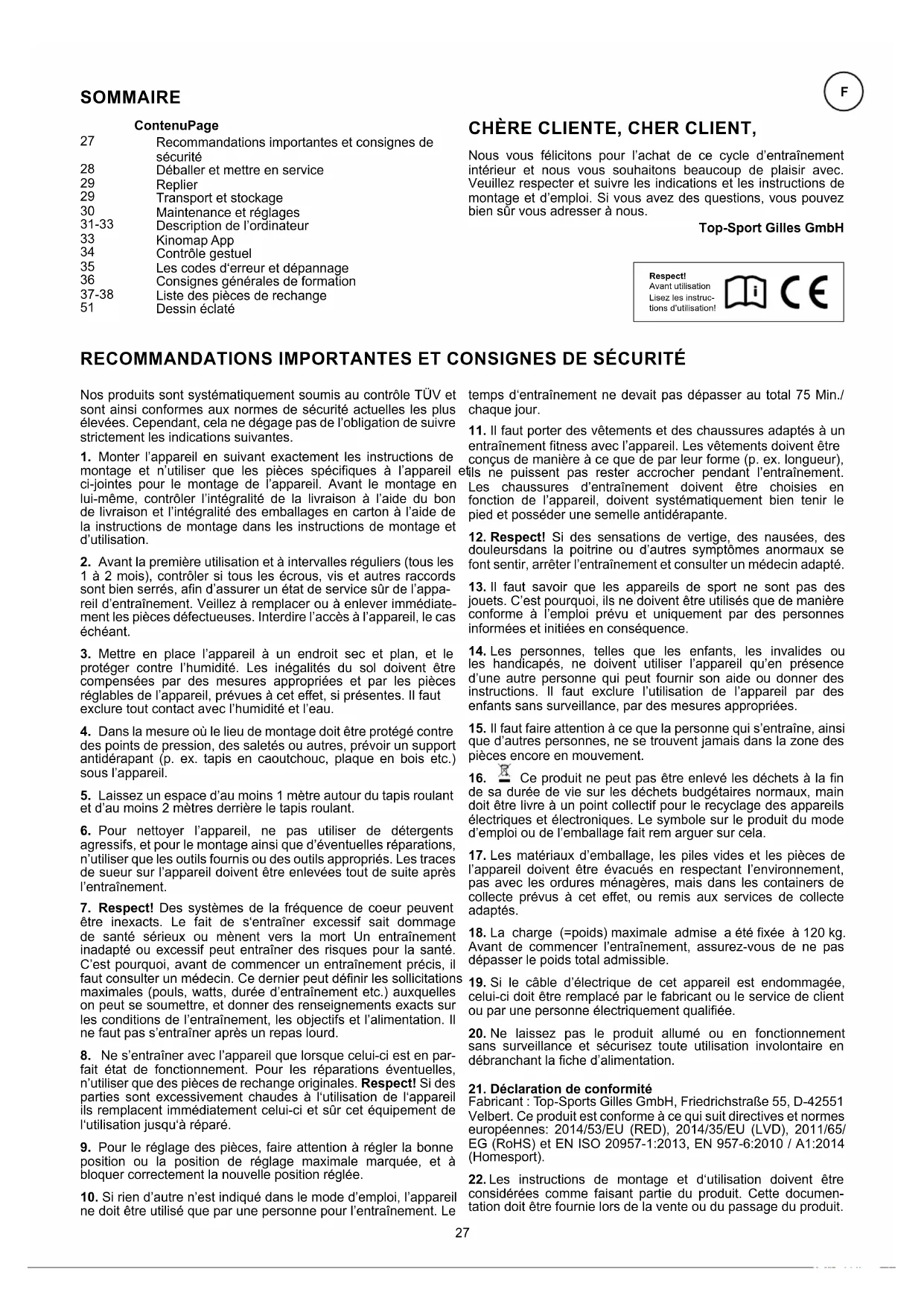 SOMMAIRE CHÈRE CLIENTE, CHER CLIENT, Nous vous félicitons pour l’achat de ce cycle d’entraînement intérieur et nous vous souhaitons beaucoup de plaisir avec. Veuillez respecter et suivre les indications et les instructions de montage et d’emploi. Si vous avez des questions, vous pouvez bien sûr vous adresser à nous. Top-Sport Gilles GmbH ContenuPage Respect! Avant utilisation Lisez les instruc- tions d’utilisation! RECOMMANDATIONS IMPORTANTES ET CONSIGNES DE SÉCURITÉ Nos produits sont systématiquement soumis au contrôle TÜV et sont ainsi conformes aux normes de sécurité actuelles les plus élevées. Cependant, cela ne dégage pas de l’obligation de suivre strictement les indications suivantes.