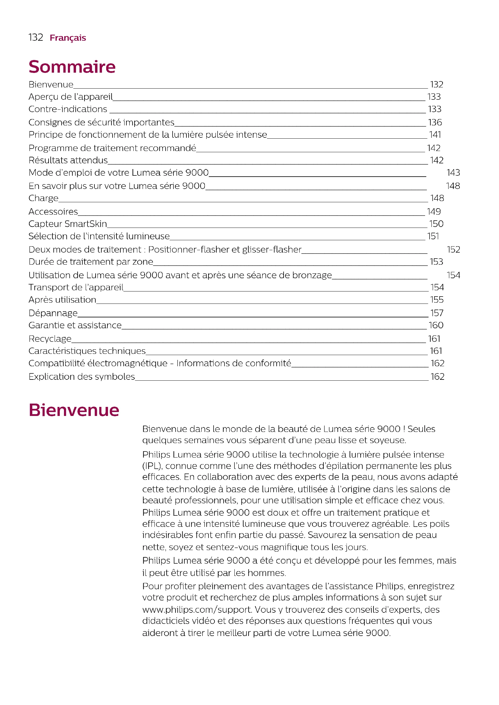Français Sommaire Bienvenue_____________________________________________________________________________________________ 132 Aperçu de l’appareil__________________________________________________________________________________ 133 Contre-indications ___________________________________________________________________________________ 133 Consignes de sécurité importantes__________________________________________________________________ 136 Principe de fonctionnement de la lumière pulsée intense__________________________________________ 141 Programme de traitement recommandé____________________________________________________________ 142 Résultats attendus____________________________________________________________________________________ 142 Mode d’emploi de votre Lumea série9000_________________________________________________________ 143 En savoir plus sur votre Lumea série9000__________________________________________________________ 148 Charge_________________________________________________________________________________________________ 148 Accessoires___________________________________________________________________________________________ 149 Capteur SmartSkin____________________________________________________________________________________ 150 Sélection de l’intensité lumineuse___________________________________________________________________ 151 Deux modes de traitement: Positionner-flasher et glisser-flasher_________________________________ 152 Durée de traitement par zone________________________________________________________________________ 153 Utilisation de Lumea série9000 avant et après une séance de bronzage_________________________ 154 Transport de l’appareil________________________________________________________________________________ 154 Après utilisation_______________________________________________________________________________________ 155 Dépannage____________________________________________________________________________________________ 157 Garantie et assistance________________________________________________________________________________ 160 Recyclage_____________________________________________________________________________________________ 161 Caractéristiques techniques__________________________________________________________________________ 161 Compatibilité électromagnétique - Informations de conformité____________________________________ 162 Explication des symboles_____________________________________________________________________________ 162 Bienvenue Bienvenue dans le monde de la beauté de Lumeasérie9000! Seules quelques semaines vous séparent d’une peau lisse et soyeuse. Philips Lumea série9000 utilise la technologie à lumière pulsée intense (IPL), connue comme l’une des méthodes d’épilation permanente les plus efficaces. En collaboration avec des experts de la peau, nous avons adapté cette technologie à base de lumière, utilisée à l’origine dans les salons de beauté professionnels, pour une utilisation simple et efficace chez vous. Philips Lumea série9000 est doux et offre un traitement pratique et efficace à une intensité lumineuse que vous trouverez agréable. Les poils indésirables font enfin partie du passé. Savourez la sensation de peau nette, soyez et sentez-vous magnifique tous les jours. PhilipsLumea série9000 a été conçu et développé pour les femmes, mais il peut être utilisé par les hommes. Pour profiter pleinement des avantages de l’assistance Philips, enregistrez votre produit et recherchez de plus amples informations à son sujet sur www.philips.com/support. Vous y trouverez des conseils d’experts, des didacticiels vidéo et des réponses aux questions fréquentes qui vous aideront à tirer le meilleur parti de votre Lumea série9000.133 Français Remarque: Conservez ces instructions avec votre produit en toutes circonstances. Aperçu de l’appareil 1 Verre filtrant avec filtre UV intégré 2 Accessoires a Accessoire corps b Accessoire visage c Accessoire maillot (BRI957, BRI958) d Embout aisselles (BRI957, BRI958) e Accessoire de précision (BRI955) 3 Capteur SmartSkin 4 Système de sécurité intégré 5 Réflecteur intégré à l'accessoire 6 Contacts électroniques 7 Accès aux contacts électroniques 8 Bouton Flash 9 Bouton marche/arrêt 10 Bouton confirmation 11 Bouton de sélection d'intensité 12 Voyants d’intensité 13 Bouton de recommandation de réglage 14 Voyant «PRÊT à flasher» 15 Fentes de ventilation 16 Prise de l'appareil 17 Adaptateur 18 Petite fiche 19 Housse de luxe (non illustrée) 20 Tissu de nettoyage (non illustrée) Contre-indications Conditions d’utilisation N’utilisez jamais l’appareil: