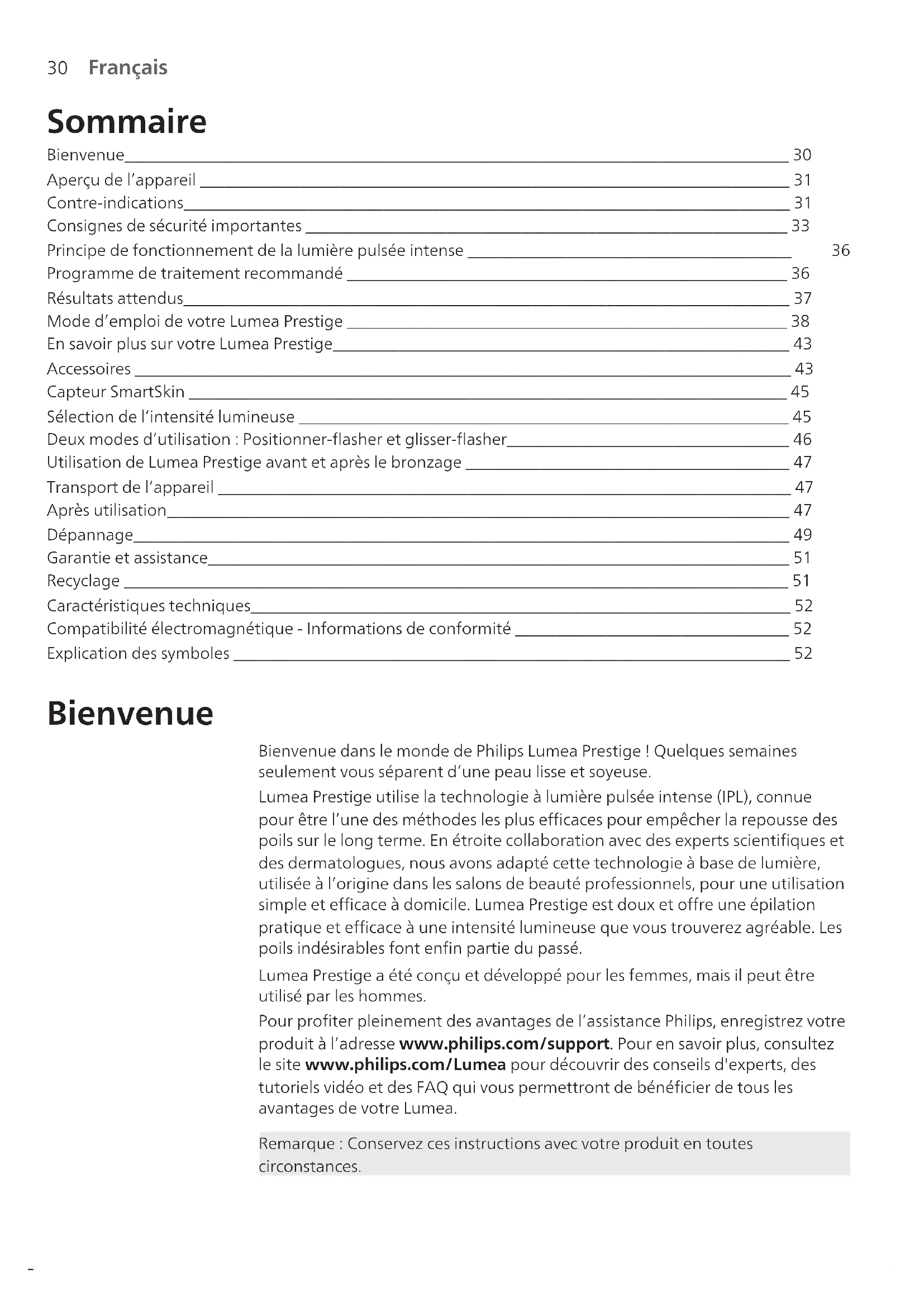 Français Sommaire Bienvenue________________________________________________________________________________ 30 Aperçu de l’appareil _______________________________________________________________________ 31 Contre-indications_________________________________________________________________________ 31 Consignes de sécurité importantes __________________________________________________________ 33 Principe de fonctionnement de la lumière pulsée intense _______________________________________ 36 Programme de traitement recommandé _____________________________________________________ 36 Résultats attendus_________________________________________________________________________ 37 Mode d’emploi de votre Lumea Prestige _____________________________________________________ 38 En savoir plus sur votre Lumea Prestige_______________________________________________________ 43 Accessoires _______________________________________________________________________________ 43 Capteur SmartSkin ________________________________________________________________________ 45 Sélection de l’intensité lumineuse ___________________________________________________________ 45 Deux modes d’utilisation: Positionner-flasher et glisser-flasher__________________________________ 46 Utilisation de Lumea Prestige avant et après le bronzage _______________________________________ 47 Transport de l’appareil _____________________________________________________________________ 47 Après utilisation___________________________________________________________________________ 47 Dépannage_______________________________________________________________________________ 49 Garantie et assistance______________________________________________________________________ 51 Recyclage ________________________________________________________________________________ 51 Caractéristiques techniques_________________________________________________________________ 52 Compatibilité électromagnétique - Informations de conformité _________________________________ 52 Explication des symboles ___________________________________________________________________ 52 Bienvenue Bienvenue dans le monde de Philips Lumea Prestige! Quelques semaines seulement vous séparent d’une peau lisse et soyeuse. Lumea Prestige utilise la technologie à lumière pulsée intense (IPL), connue pour être l’une des méthodes les plus efficaces pour empêcher la repousse des poils sur le long terme. En étroite collaboration avec des experts scientifiques et des dermatologues, nous avons adapté cette technologie à base de lumière, utilisée à l’origine dans les salons de beauté professionnels, pour une utilisation simple et efficace à domicile. Lumea Prestige est doux et offre une épilation pratique et efficace à une intensité lumineuse que vous trouverez agréable. Les poils indésirables font enfin partie du passé. Lumea Prestige a été conçu et développé pour les femmes, mais il peut être utilisé par les hommes. Pour profiter pleinement des avantages de l’assistance Philips, enregistrez votre produit à l’adresse www.philips.com/support. Pour en savoir plus, consultez le site www.philips.com/Lumea pour découvrir des conseils d'experts, des tutoriels vidéo et des FAQ qui vous permettront de bénéficier de tous les avantages de votre Lumea. Remarque: Conservez ces instructions avec votre produit en toutes circonstances.31 Français Aperçu de l’appareil 1 Verre filtrant avec filtre UV intégré 2 Accessoires a Accessoire corps b Embout aisselles (BRI946, BRI947, BRI948) c Accessoire maillot (BRI946, BRI947, BRI948) d Accessoire visage (BRI944, BRI945, BRI946, BRI947, BRI948) 3 Capteur SmartSkin 4 Système de sécurité intégré 5 Réflecteur intégré à l'accessoire 6 Contacts électroniques 7 Accès aux contacts électroniques 8 Bouton Flash 9 Bouton marche/arrêt 10 Bouton confirmation 11 Bouton de sélection d'intensité 12 Voyants d’intensité 13 Bouton SmartSkin 14 Voyant «PRÊT à flasher» 15 Fentes de ventilation 16 Prise de l'appareil 17 Adaptateur 18 Petite fiche 19 Trousse (non illustrée) 20 Tissu de nettoyage (non illustrée) Contre-indications Conditions d’utilisation N’utilisez jamais l’appareil: