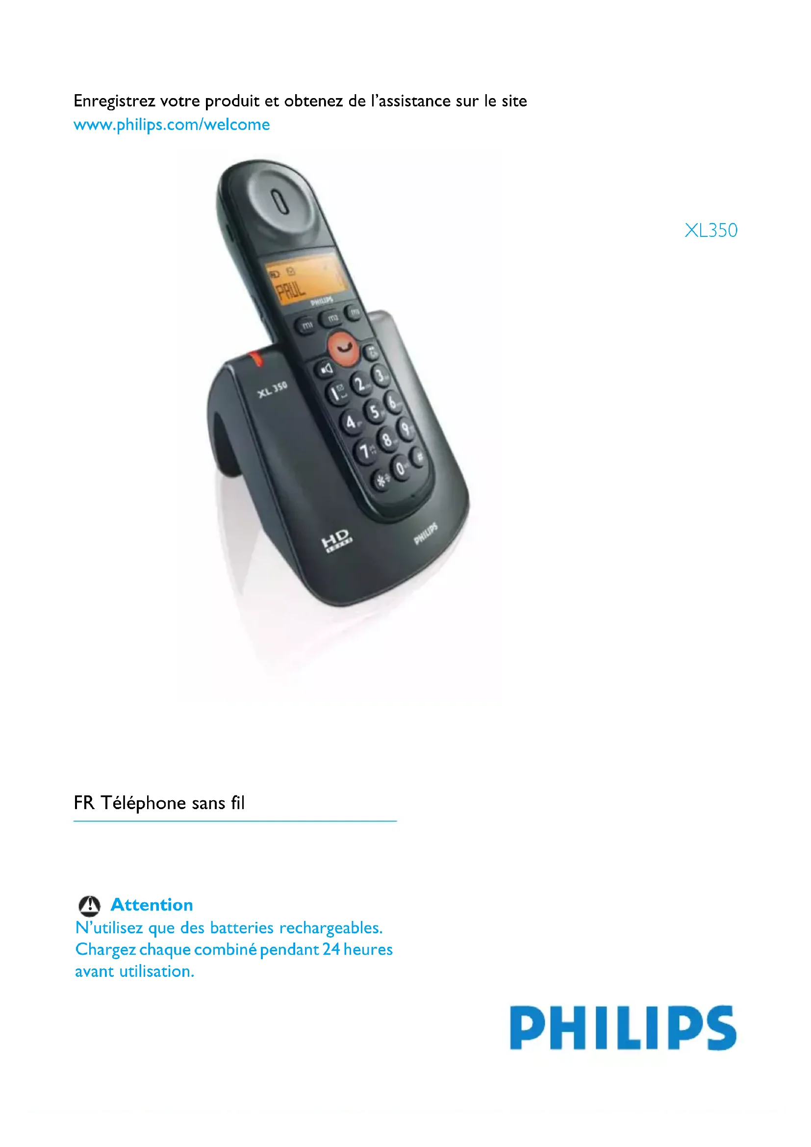 www.philips.com/welcome FR Téléphone sans fil XL350 Attention N’utilisez que des batteries rechargeables. Chargez chaque combiné pendant 24 heures avant utilisation.
