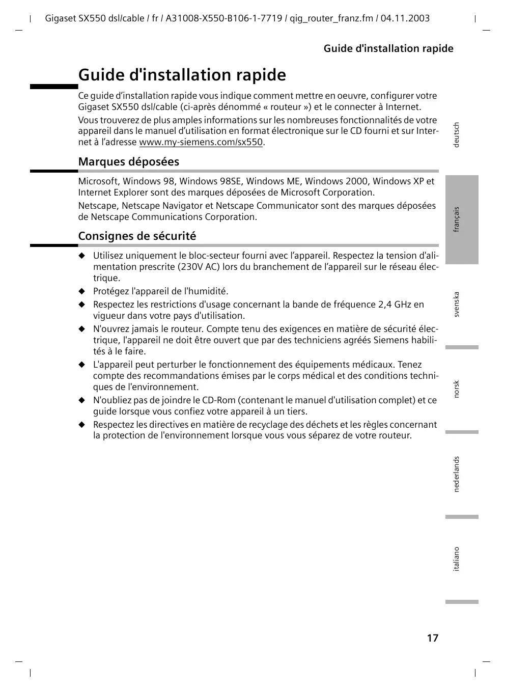 Gigaset SX550 dsl/cable / fr / A31008-X550-B106-1-7719 / qig_router_franz.fm / 04.11.2003 Guide d'installation rapide Ce guide d’installation rapide vous indique comment mettre en oeuvre, configurer votre Gigaset SX550 dsl/cable (ci-après dénommé « routeur ») et le connecter à Internet. Vous trouverez de plus amples informations sur les nombreuses fonctionnalités de votre appareil dans le manuel d’utilisation en format électronique sur le CD fourni et sur Internet à l’adresse www.my-siemens.com/sx550. deutsch Guide d'installation rapide Microsoft, Windows 98, Windows 98SE, Windows ME, Windows 2000, Windows XP et Internet Explorer sont des marques déposées de Microsoft Corporation. Netscape, Netscape Navigator et Netscape Communicator sont des marques déposées de Netscape Communications Corporation. Consignes de sécurité français Marques déposées