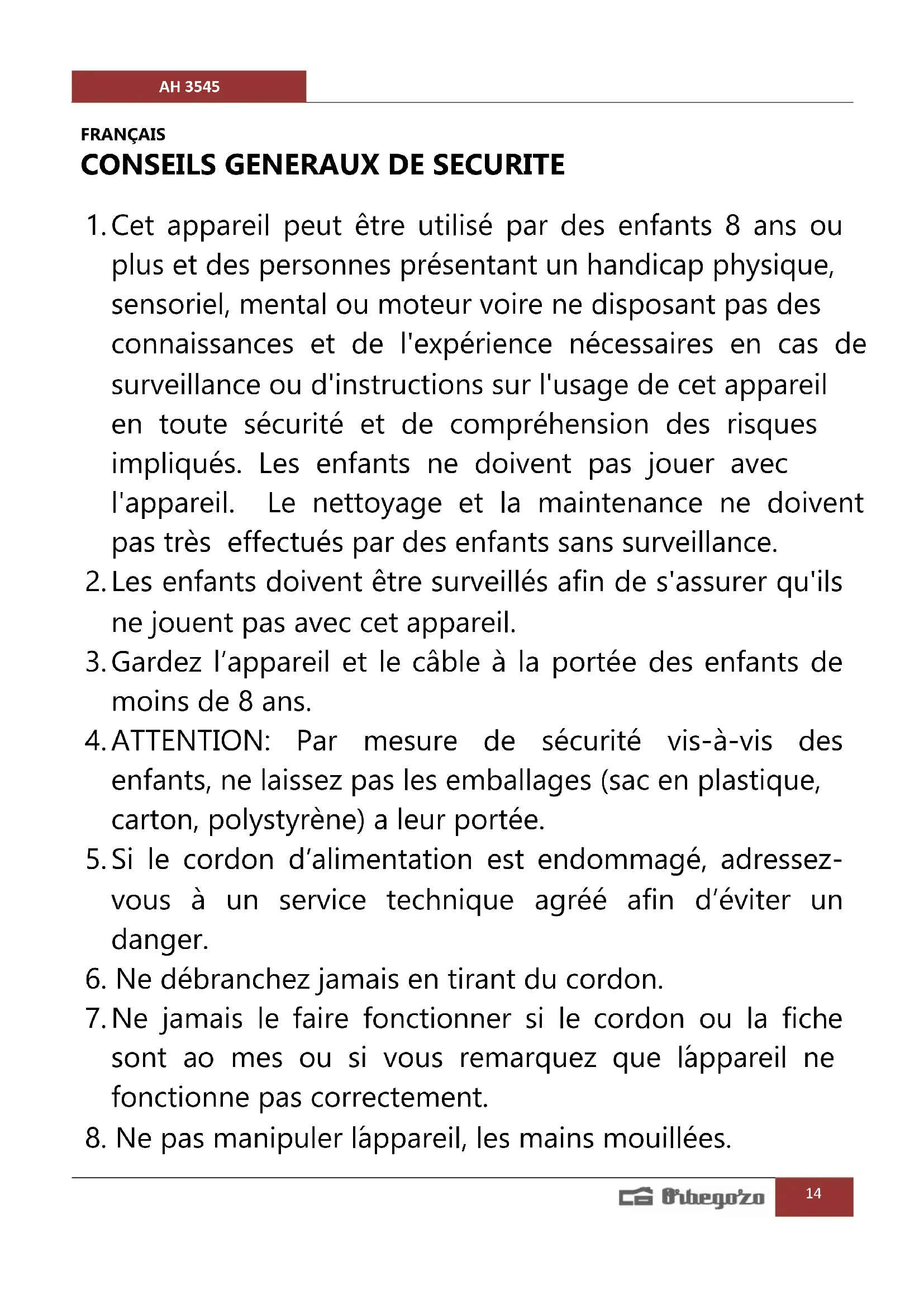 La directive européenne 2012/19/EU sur les Déchets des Equipements Electriques et Electroniques (DEEE), exige que les appareils ménagers usages ne soient pas jetés dans le flux normal des déchets municipaux. Les appareils usagés doivent être collectés séparément afin d’optimiser le taux de récupération et le recyclage des matériaux qui les composent, et réduire l’impact sur la santé humaine et l’environnement. Le symbole de la poubelle barrée est apposée sur tous les produits pour rappeler les obligations de collète séparée. Les consommateurs devront contacter les autorités locales ou leur revendeur concernant la démarche à suivre pour l’enlèvement de leur vieil appareil. DÉCLARATION DE CONFORMITÉ: Cet appareil est conforme aux exigences de la Directive Basse Tension 2014/35/EU et aux exigences de la directive EMC 2014/30/EU. GARANTIE Cet appareil est couvert et bénéficie de la garantie légale conformément à la législation en vigueur à compter de la date d'achat. Conservez le reçu d'achat pour pouvoir faire valoir votre droit à la garantie. Pour trouver le service le plus proche de votre emplacement, contactez via le lien Web suivant : https://orbegozo.com/asistencia-tecnica/ Pour tout type de requête, doute ou incident, vous pouvez nous contacter via notre e-mail indiqué sur la page principale de ce manuel ou via notre service d'assistance technique à https://orbegozo.com/contacto/ Orbegozo n'est pas responsable des composants et accessoires soumis à l'usure due à l'utilisation, ainsi que des composés périssables ou de ceux qui se sont détériorés en raison d'une mauvaise utilisation. Il ne sera pas non plus tenu responsable si le propriétaire a modifié techniquement l'appareil. Consultez les conditions légales sur notre site.AH 3545