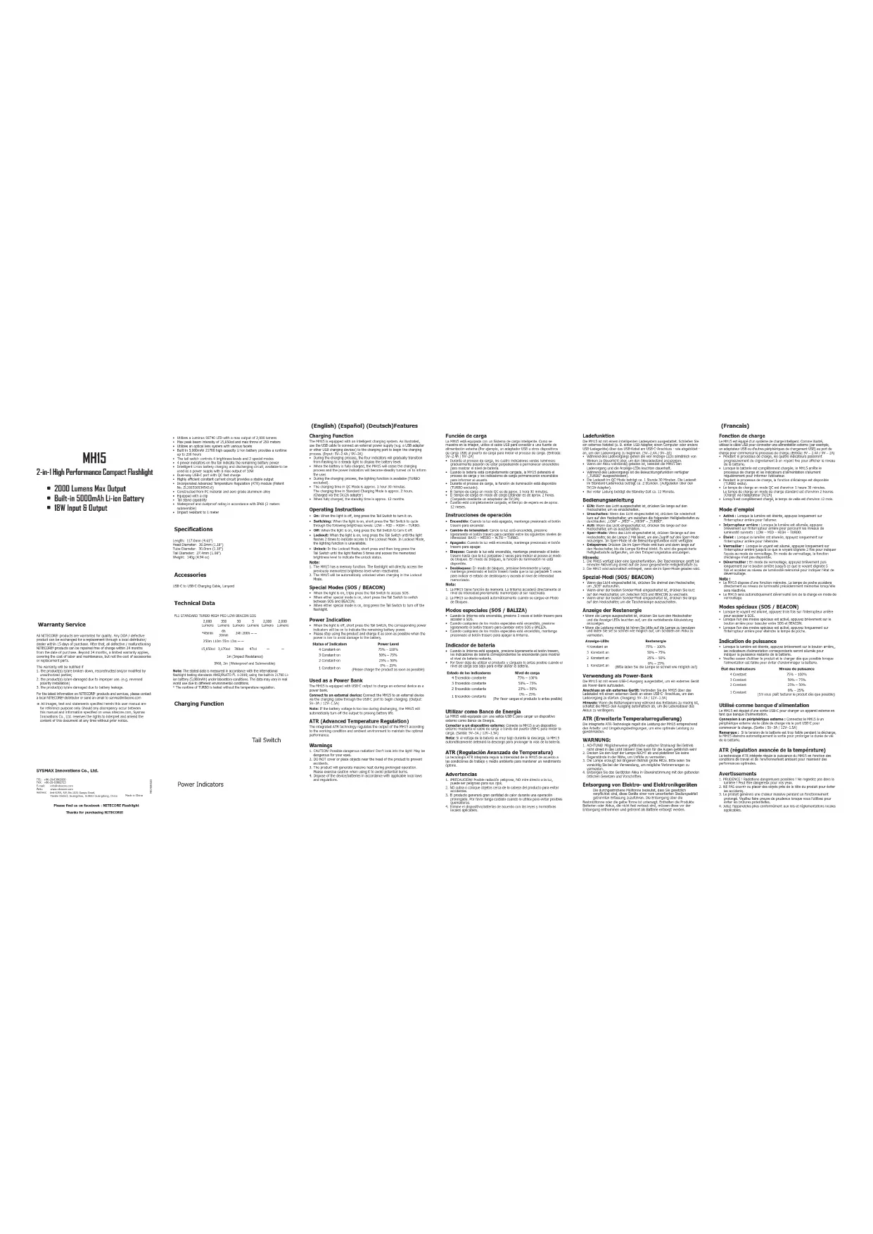 - When the light is o, short press the Tail Switch, the corresponding power indicators will be on to indicate the remaining battery power.• Please stop using the product and charge it as soon as possible when the power is low to avoid damage to the battery.Status of Indicators Power Level4 Constant-on 75% – 100%3 Constant-on 50% – 75%2 Constant-on 25% – 50%1 Constant-on0% – 25% (Please charge the product as soon as possible) Used as a Power Bank The MH15 is equipped with USB-C output to charge an external device as a power bank.Connect to an external device: Connect the MH15 to an external device via the charging cable through the USB-C port to begin charging. (Output: 5V⎓3A / 12V⎓1.5A)Note: If the battery voltage is too low during discharging, the MH15 will automatically turn o the output to prolong battery life. ATR (Advanced Temperature Regulation) The integrated ATR technology regulates the output of the MH15 according to the working condition and ambient environment to maintain the optimal performance. Warnings 1. CAUTION! Possible dangerous radiation! Don't look into the light! May be dangerous for your eyes.2. DO NOT cover or place objects near the head of the product to prevent accidents.3. The product will generate massive heat during prolonged operation. Please exercise caution when using it to avoid potential burns.4. Dispose of the device/batteries in accordance with applicable local laws and regulations. Fonction de charge Le MH15 est équipé d'un système de charge intelligent. Comme illustré, utilisez le câble USB pour connecter une alimentation externe (par exemple, un adaptateur USB ou d'autres périphériques de chargement USB) au port de charge pour commencer le processus de charge. (Entrée: 5V ⎓ 2.4A / 9V ⎓ 2A)