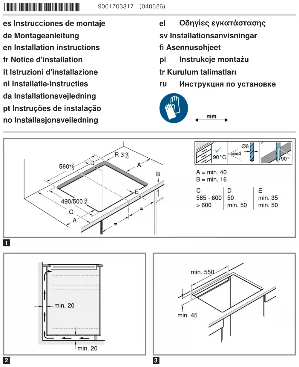 Indications générales ¡ Lisez attentivement cette notice. ¡ Seul un spécialiste agréé est autorisé à brancher l'appareil. ¡ Une installation, une ouverture de l'appa- reil, un raccordement ou un montage in- corrects annulent la validité de la garantie du produit. ¡ Avant toute intervention sur l'appareil, coupez l'alimentation électrique. ¡ Après l'installation, s'assurer que l'utilisa- teur n'a aucun accès aux pièces élec- triques. ¡ N'utilisez jamais cet appareil dans un ba- teau ou un véhicule. Installation en toute sécurité Respectez les consignes de sécurité lorsque vous installez cet appareil. La sécurité de l’appareil à l’usage est ga- rantie s’il a été incorporé conformément aux instructions de montage. Le monteur est responsable du fonctionnement correct de l'appareil sur le lieu où ce dernier est instal- lé. AVERTISSEMENT‒Danger: magnétisme! L'appareil contient des aimants permanents. Ceux-ci peuvent influer sur des implants électroniques, par ex. des stimulateurs car- diaques ou des pompes à insuline. ▶ Les personnes portant un implant électro- nique doivent donc respecter une dis- tance minimum de 10cm avec l’appareil. AVERTISSEMENT‒Risque de blessure! Les pièces accessibles lors de l'installation peuvent présenter des arêtes vives et pro- voquer des coupures. ▶ Portez des gants de protection. Les produits chimiques peuvent être dange- reux. Les recommandations des fabricants de produits chimiques doivent être respec- tées lors de la manipulation de produits chi- miques. ▶ Portez un équipement de protection. Conseils concernant le branchement électrique Respectez les conseils suivant pour pouvoir effec- tuer le branchement électrique de l'appareil en toute sécurité. ¡ Seul un spécialiste agréé ou un technicien de ser- vice spécialement formé est habilité à raccorder l'appareil. La personne doit être agréée conformé- ment aux réglementations locales du pays et de la compagnie d'électricité. ¡ Raccorder l'appareil à une installation fixe et des sectionneurs correspondants doivent être installés conformément aux prescriptions d'installation. ¡ Le fabricant décline toute responsabilité pour des dérangements ou dommages éventuels dus à une installation électrique incorrecte. Type de connexion ¡ Cet appareil est conforme à la classe de protec- tion 1. Par conséquent, utiliser l'appareil unique- ment avec une prise à conducteur de protection. Cordon d'alimentation Le cordon d'alimentation peut être raccordé à la prise de raccordement de la table de cuisson ou être joint à l'appareil. ¡ Vous trouverez les valeurs de raccordement re- quises sur la plaque signalétique et sur le schéma de raccordement. ¡ Utiliser uniquement le câble de raccordement fourni avec l'appareil ou fourni par le service après-vente. Si vous avez besoin d'un câble plus long, contactez le service après-vente. Des cor- dons d'alimentation secteur jusqu'à 2,20 m de lon- gueur sont disponibles.11 Conseils concernant les meubles d'encastrement ¡ Vous pouvez installer la table à induction unique- ment via des tiroirs ou des fours à ventilation for- cée. Ne pas installer de réfrigérateur, de lave-vais- selle, de four non ventilé ou de lave-linge sous la table de cuisson. ¡ S'assurer que les meubles d'encastrement ré- sistent à la chaleur jusqu'au moins 90°C. Plan de travail Respecter les recommandations du fabricant du plan de travail. ¡ À plat, à l'horizontale, stable. ¡ Le plan de travail dans lequel vous intégrez l'ap- pareil doit pouvoir supporter une charge d'environ 60kg. ¡ Pour des plans de travail minces, utiliser un maté- riau de renforcement résistant à la chaleur et á l'humidité. ¡ Vérifier la planéité de la table de cuisson une fois qu'elle est montée. Hotte ¡ La distance entre la hotte et la table de cuisson doit être au moins égale à la distance indiquée dans les instructions de montage de la hotte. Préparation des meubles d'encastrement