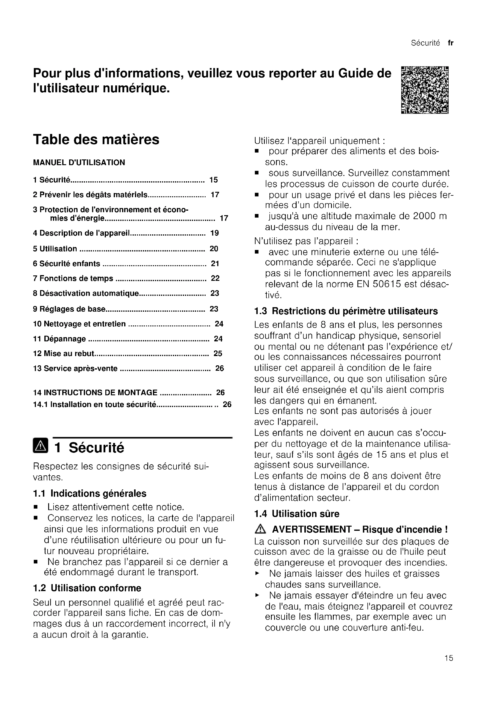 1 Sécurité Respectez les consignes de sécurité sui- vantes. 1.1 Indications générales ¡ Lisez attentivement cette notice. ¡ Conservez les notices, la carte de l'appareil ainsi que les informations produit en vue d’une réutilisation ultérieure ou pour un fu- tur nouveau propriétaire. ¡ Ne branchez pas l’appareil si ce dernier a été endommagé durant le transport. 1.2 Utilisation conforme Seul un personnel qualifié et agréé peut rac- corder l'appareil sans fiche. En cas de dom- mages dus à un raccordement incorrect, il n'y a aucun droit à la garantie. Utilisez l‘appareil uniquement: ¡ pour préparer des aliments et des bois- sons. ¡ sous surveillance. Surveillez constamment les processus de cuisson de courte durée. ¡ pour un usage privé et dans les pièces fer- mées d’un domicile. ¡ jusqu'à une altitude maximale de 2000m au-dessus du niveau de la mer. N’utilisez pas l’appareil: ¡ avec une minuterie externe ou une télé- commande séparée. Ceci ne s'applique pas si le fonctionnement avec les appareils relevant de la norme EN 50615 est désac- tivé. 1.3 Restrictions du périmètre utilisateurs Les enfants de 8 ans et plus, les personnes souffrant d’un handicap physique, sensoriel ou mental ou ne détenant pas l’expérience et/ ou les connaissances nécessaires pourront utiliser cet appareil à condition de le faire sous surveillance, ou que son utilisation sûre leur ait été enseignée et qu’ils aient compris les dangers qui en émanent. Les enfants ne sont pas autorisés à jouer avec l'appareil. Les enfants ne doivent en aucun cas s’occu- per du nettoyage et de la maintenance utilisa- teur, sauf s’ils sont âgés de 15ans et plus et agissent sous surveillance. Les enfants de moins de 8ans doivent être tenus à distance de l’appareil et du cordon d’alimentation secteur. 1.4 Utilisation sûre AVERTISSEMENT‒Risque d'incendie! La cuisson non surveillée sur des plaques de cuisson avec de la graisse ou de l'huile peut être dangereuse et provoquer des incendies. ▶ Ne jamais laisser des huiles et graisses chaudes sans surveillance. ▶ Ne jamais essayer d'éteindre un feu avec de l'eau, mais éteignez l'appareil et couvrez ensuite les flammes, par exemple avec un couvercle ou une couverture anti-feu.fr Sécurité