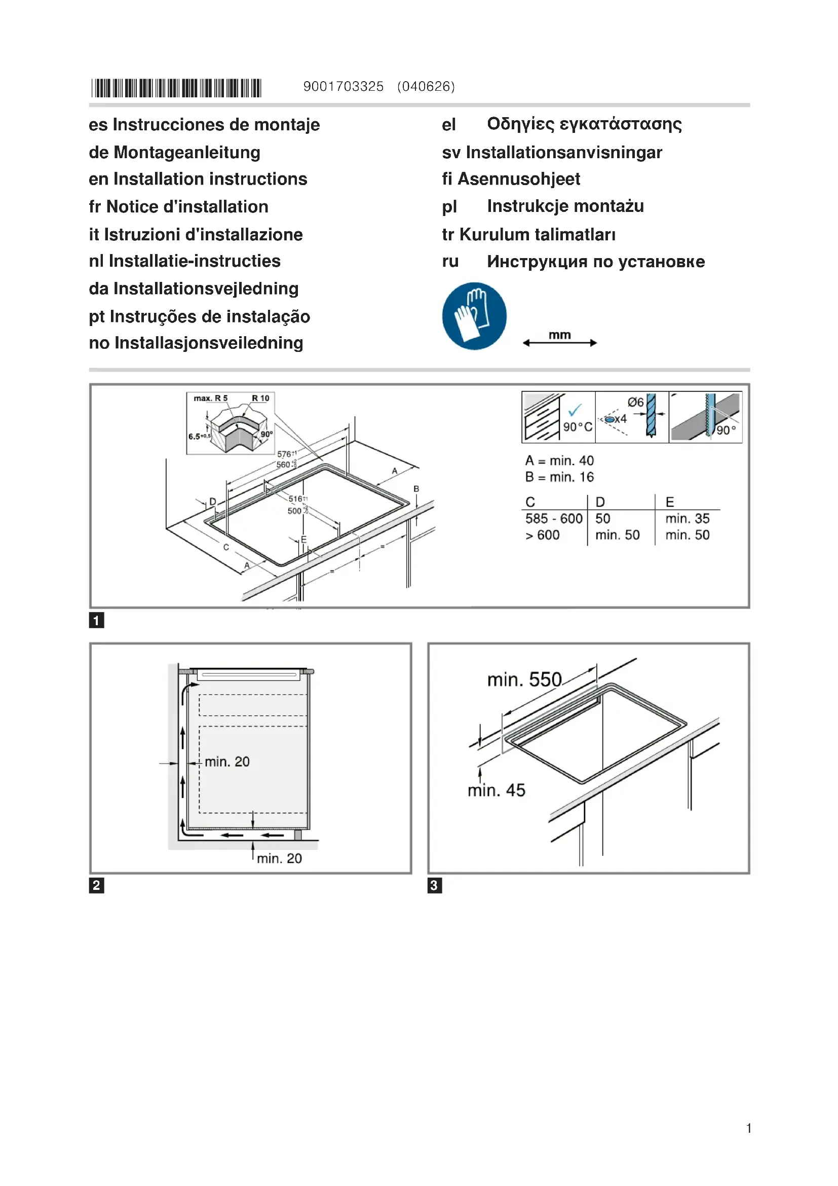 Indications générales ¡ Lisez attentivement cette notice. ¡ Seul un spécialiste agréé est autorisé à brancher l'appareil. ¡ Une installation, une ouverture de l'appa- reil, un raccordement ou un montage in- corrects annulent la validité de la garantie du produit. ¡ Avant toute intervention sur l'appareil, coupez l'alimentation électrique. ¡ Après l'installation, s'assurer que l'utilisa- teur n'a aucun accès aux pièces élec- triques. ¡ N'utilisez jamais cet appareil dans un ba- teau ou un véhicule. Installation en toute sécurité Respectez les consignes de sécurité lorsque vous installez cet appareil. La sécurité de l’appareil à l’usage est ga- rantie s’il a été incorporé conformément aux instructions de montage. Le monteur est responsable du fonctionnement correct de l'appareil sur le lieu où ce dernier est instal- lé. AVERTISSEMENT‒Danger: magnétisme! L'appareil contient des aimants permanents. Ceux-ci peuvent influer sur des implants électroniques, par ex. des stimulateurs car- diaques ou des pompes à insuline. ▶ Les personnes portant un implant électro- nique doivent donc respecter une dis- tance minimum de 10cm avec l’appareil. AVERTISSEMENT‒Risque de blessure! Les pièces accessibles lors de l'installation peuvent présenter des arêtes vives et pro- voquer des coupures. ▶ Portez des gants de protection. Les produits chimiques peuvent être dange- reux. Les recommandations des fabricants de produits chimiques doivent être respec- tées lors de la manipulation de produits chi- miques. ▶ Portez un équipement de protection. Conseils concernant le branchement électrique Respectez les conseils suivant pour pouvoir effec- tuer le branchement électrique de l'appareil en toute sécurité.12 ¡ Seul un spécialiste agréé ou un technicien de ser- vice spécialement formé est habilité à raccorder l'appareil. La personne doit être agréée conformé- ment aux réglementations locales du pays et de la compagnie d'électricité. ¡ Raccorder l'appareil à une installation fixe et des sectionneurs correspondants doivent être installés conformément aux prescriptions d'installation. ¡ Le fabricant décline toute responsabilité pour des dérangements ou dommages éventuels dus à une installation électrique incorrecte. Type de connexion ¡ Cet appareil est conforme à la classe de protec- tion 1. Par conséquent, utiliser l'appareil unique- ment avec une prise à conducteur de protection. Cordon d'alimentation Le cordon d'alimentation peut être raccordé à la prise de raccordement de la table de cuisson ou être joint à l'appareil. ¡ Vous trouverez les valeurs de raccordement re- quises sur la plaque signalétique et sur le schéma de raccordement. ¡ Utiliser uniquement le câble de raccordement fourni avec l'appareil ou fourni par le service après-vente. Si vous avez besoin d'un câble plus long, contactez le service après-vente. Des cor- dons d'alimentation secteur jusqu'à 2,20 m de lon- gueur sont disponibles. Conseils concernant les meubles d'encastrement ¡ Vous pouvez installer la table à induction unique- ment via des tiroirs ou des fours à ventilation for- cée. Ne pas installer de réfrigérateur, de lave-vais- selle, de four non ventilé ou de lave-linge sous la table de cuisson. ¡ S'assurer que les meubles d'encastrement ré- sistent à la chaleur jusqu'au moins 90°C. Plan de travail Respecter les recommandations du fabricant du plan de travail. ¡ À plat, à l'horizontale, stable. ¡ Le plan de travail dans lequel vous intégrez l'ap- pareil doit pouvoir supporter une charge d'environ 60kg. ¡ Pour des plans de travail minces, utiliser un maté- riau de renforcement résistant à la chaleur et á l'humidité. ¡ Vérifier la planéité de la table de cuisson une fois qu'elle est montée. ¡ Vous pouvez intégrer l'appareil dans les plans de travail résistants aux températures élevées et étanches suivants : – Plans de travail en marbre, pierre naturelle. – Plans de travail en matière plastique. – Plans de travail en bois massif, uniquement avec l'accord du fabricant du plan de travail, sceller les bords de coupe. – D'autres plans de travail, uniquement avec l'ac- cord du fabricant du plan de travail. ¡ Pour aligner l'appareil, ne pas utiliser de supports à des points individuels. ¡ Les travaux de découpe sur le plan de travail doivent être effectués par une entreprise spéciali- sée conformément au croquis de montage. L'arête de coupe doit être propre et précise car le bord est visible sur la surface. Nettoyer et dégraisse´r les arêtes de coupe à l'aide d'un détergent adap- té. Hotte ¡ La distance entre la hotte et la table de cuisson doit être au moins égale à la distance indiquée dans les instructions de montage de la hotte. Préparation des meubles d'encastrement