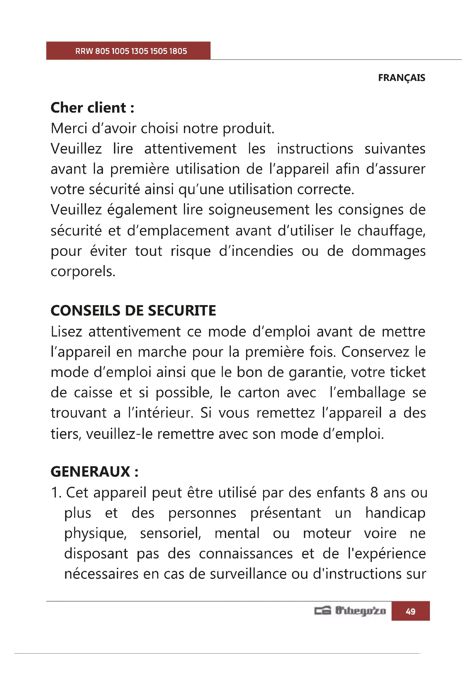 La directive européenne 2012/19/EU sur les Déchets des Equipements Electriques et Electroniques (DEEE), exige que les appareils ménagers usages ne soient pas jetés dans le flux normal des déchets municipaux. Les appareils usagés doivent être collectés séparément afin d’optimiser le taux de récupération et le recyclage des matériaux qui les composent, et réduire l’impact sur la santé humaine et l’environnement. Le symbole de la poubelle barrée est apposée sur tous les produits pour rappeler les obligations de collète séparée. Les consommateurs devront contacter les autorités locales ou leur revendeur concernant la démarche à suivre pour l’enlèvement de leur vieil appareil. DÉCLARATION DE CONFORMITÉ: Cet appareil est conforme aux exigences de la Directive Basse Tension 2014/35/EU et aux exigences de la directive EMC 2014/30/EU. Par la présente, Sonifer S.A. déclare que l'équipement de radiateur de type RRW 805 / RRW 1005 / RRW 1305 / RRW 1505 / RRW 1805 est conforme à la directive 2014/53 / UE. GARANTIE Cet appareil est couvert et bénéficie de la garantie légale conformément à la législation en vigueur à compter de la date d'achat. Conservez le reçu d'achat pour pouvoir faire valoir votre droit à la garantie. Pour trouver le service le plus proche de votre emplacement, contactez via le lien Web suivant : https://orbegozo.com/asistencia-tecnica/ Pour tout type de requête, doute ou incident, vous pouvez nous contacter via notre e-mail indiqué sur la page principale de ce manuel ou via notre service d'assistance technique à https://orbegozo.com/contacto/ Orbegozo n'est pas responsable des composants et accessoires soumis à l'usure due à l'utilisation, ainsi que des composés périssables ou de ceux qui se sont détériorés en raison d'une mauvaise utilisation. Il ne sera pas non plus tenu responsable si le propriétaire a modifié techniquement l'appareil. Consultez les conditions légales sur notre site.RRW 805 1005 1305 1505 1805
