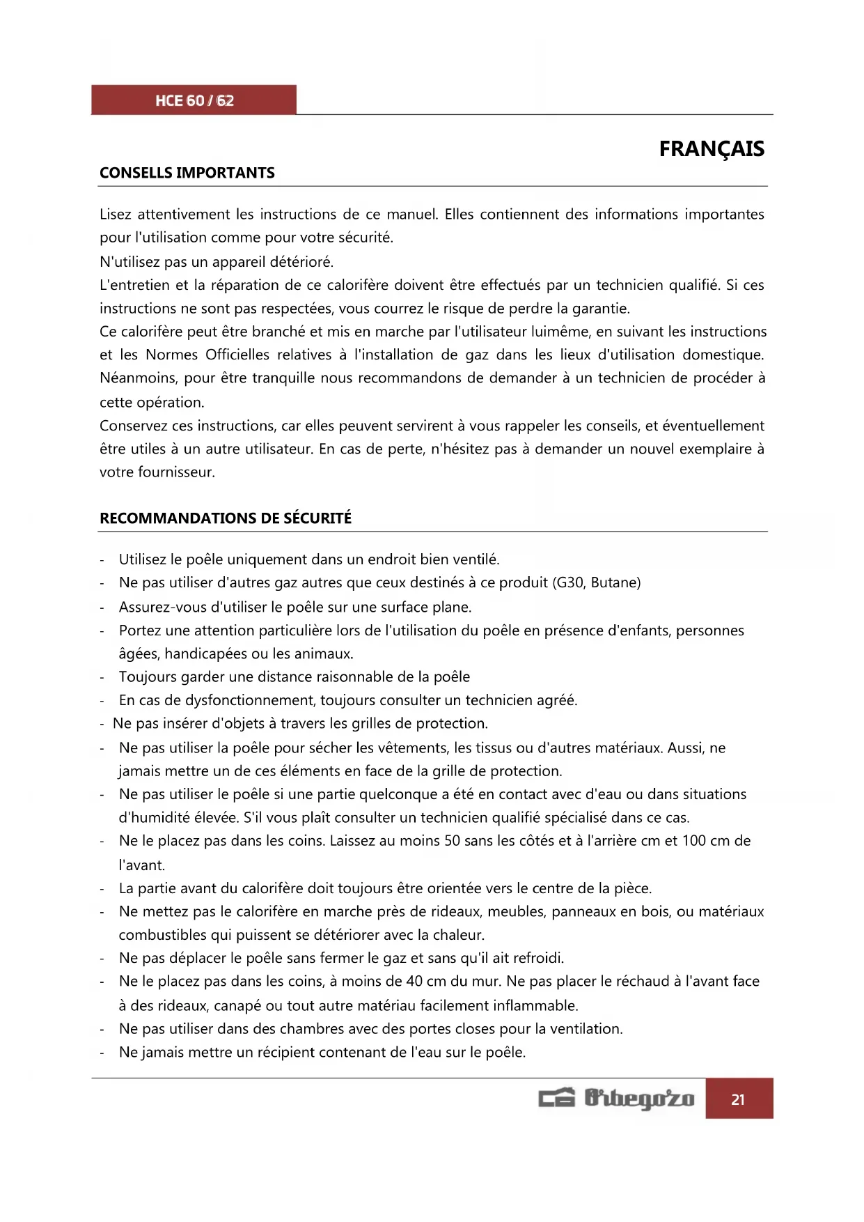 - Utilisez le poêle uniquement dans un endroit bien ventilé. - Ne pas utiliser d'autres gaz autres que ceux destinés à ce produit (G30, Butane) - Assurez-vous d'utiliser le poêle sur une surface plane. - Portez une attention particulière lors de l'utilisation du poêle en présence d'enfants, personnes âgées, handicapées ou les animaux. - Toujours garder une distance raisonnable de la poêle - En cas de dysfonctionnement, toujours consulter un technicien agréé. - Ne pas insérer d'objets à travers les grilles de protection. - Ne pas utiliser la poêle pour sécher les vêtements, les tissus ou d'autres matériaux. Aussi, ne jamais mettre un de ces éléments en face de la grille de protection. - Ne pas utiliser le poêle si une partie quelconque a été en contact avec d'eau ou dans situations d'humidité élevée. S'il vous plaît consulter un technicien qualifié spécialisé dans ce cas. - Ne le placez pas dans les coins. Laissez au moins 50 sans les côtés et à l'arrière cm et 100 cm de l'avant. - La partie avant du calorifère doit toujours être orientée vers le centre de la pièce. - Ne mettez pas le calorifère en marche près de rideaux, meubles, panneaux en bois, ou matériaux combustibles qui puissent se détériorer avec la chaleur. - Ne pas déplacer le poêle sans fermer le gaz et sans qu'il ait refroidi. - Ne le placez pas dans les coins, à moins de 40 cm du mur. Ne pas placer le réchaud à l'avant face à des rideaux, canapé ou tout autre matériau facilement inflammable. - Ne pas utiliser dans des chambres avec des portes closes pour la ventilation. - Ne jamais mettre un récipient contenant de l'eau sur le poêle.HCE 60 / 62