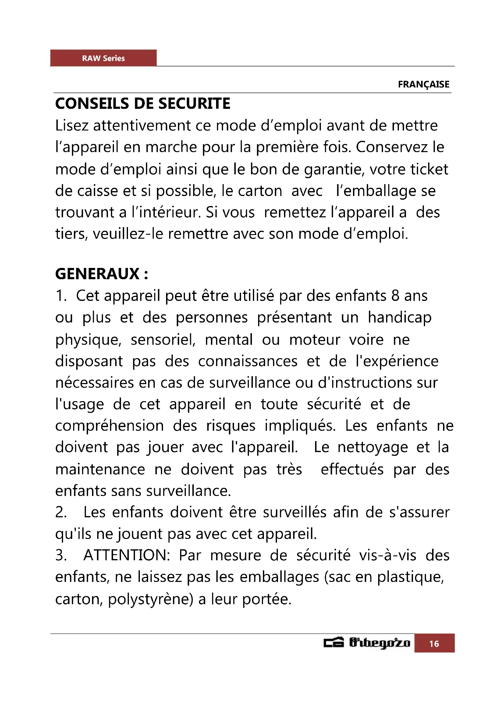 La directive européenne 2012/19/EU sur les Déchets des Equipements Electriques et Electroniques (DEEE), exige que les appareils ménagers usages ne soient pas jetés dans le flux normal des déchets municipaux. Les appareils usagés doivent être collectés séparément afin d’optimiser le taux de récupération et le recyclage des matériaux qui les composent, et réduire l’impact sur la santé humaine et l’environnement. Le symbole de la poubelle barrée est apposée sur tous les produits pour rappeler les obligations de collète séparée. Les consommateurs devront contacter les autorités locales ou leur revendeur concernant la démarche à suivre pour l’enlèvement de leur vieil appareil. DÉCLARATION DE CONFORMITÉ: Cet appareil est conforme aux exigences de la Directive Basse Tension 2014/35/EU et aux exigences de la directive EMC 2014/30/EU. GARANTIE Cet appareil est couvert et bénéficie de la garantie légale conformément à la législation en vigueur à compter de la date d'achat. Conservez le reçu d'achat pour pouvoir faire valoir votre droit à la garantie. Pour trouver le service le plus proche de votre emplacement, contactez via le lien Web suivant : https://orbegozo.com/asistencia-tecnica/ Pour tout type de requête, doute ou incident, vous pouvez nous contacter via notre e-mail indiqué sur la page principale de ce manuel ou via notre service d'assistance technique à https://orbegozo.com/contacto/ Orbegozo n'est pas responsable des composants et accessoires soumis à l'usure due à l'utilisation, ainsi que des composés périssables ou de ceux qui se sont détériorés en raison d'une mauvaise utilisation. Il ne sera pas non plus tenu responsable si le propriétaire a modifié techniquement l'appareil. Consultez les conditions légales sur notre site.RAW Series