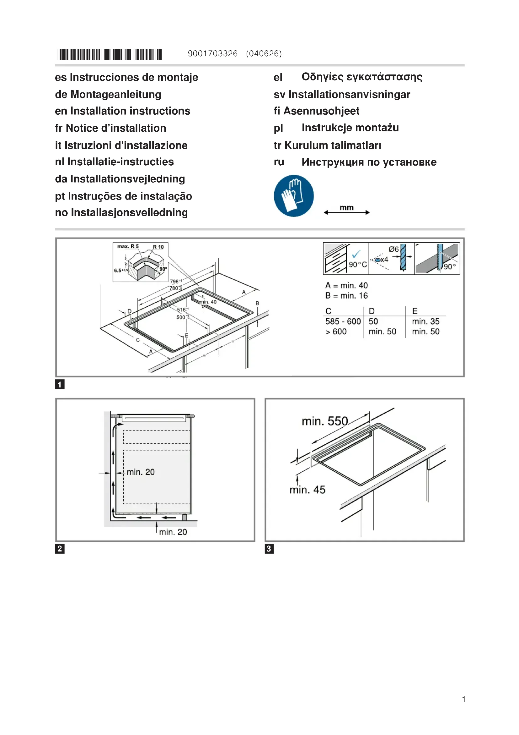 Indications générales ¡ Lisez attentivement cette notice. ¡ Seul un spécialiste agréé est autorisé à brancher l'appareil. ¡ Une installation, une ouverture de l'appa- reil, un raccordement ou un montage in- corrects annulent la validité de la garantie du produit. ¡ Avant toute intervention sur l'appareil, coupez l'alimentation électrique. ¡ Après l'installation, s'assurer que l'utilisa- teur n'a aucun accès aux pièces élec- triques. ¡ N'utilisez jamais cet appareil dans un ba- teau ou un véhicule. Installation en toute sécurité Respectez les consignes de sécurité lorsque vous installez cet appareil. La sécurité de l’appareil à l’usage est ga- rantie s’il a été incorporé conformément aux instructions de montage. Le monteur est responsable du fonctionnement correct de l'appareil sur le lieu où ce dernier est instal- lé. AVERTISSEMENT‒Danger: magnétisme! L'appareil contient des aimants permanents. Ceux-ci peuvent influer sur des implants électroniques, par ex. des stimulateurs car- diaques ou des pompes à insuline. ▶ Les personnes portant un implant électro- nique doivent donc respecter une dis- tance minimum de 10cm avec l’appareil. AVERTISSEMENT‒Risque de blessure! Les pièces accessibles lors de l'installation peuvent présenter des arêtes vives et pro- voquer des coupures. ▶ Portez des gants de protection. Les produits chimiques peuvent être dange- reux. Les recommandations des fabricants de produits chimiques doivent être respec- tées lors de la manipulation de produits chi- miques. ▶ Portez un équipement de protection.12 Conseils concernant le branchement électrique Respectez les conseils suivant pour pouvoir effec- tuer le branchement électrique de l'appareil en toute sécurité. ¡ Seul un spécialiste agréé ou un technicien de ser- vice spécialement formé est habilité à raccorder l'appareil. La personne doit être agréée conformé- ment aux réglementations locales du pays et de la compagnie d'électricité. ¡ Raccorder l'appareil à une installation fixe et des sectionneurs correspondants doivent être installés conformément aux prescriptions d'installation. ¡ Le fabricant décline toute responsabilité pour des dérangements ou dommages éventuels dus à une installation électrique incorrecte. Type de connexion ¡ Cet appareil est conforme à la classe de protec- tion 1. Par conséquent, utiliser l'appareil unique- ment avec une prise à conducteur de protection. Cordon d'alimentation Le cordon d'alimentation peut être raccordé à la prise de raccordement de la table de cuisson ou être joint à l'appareil. ¡ Vous trouverez les valeurs de raccordement re- quises sur la plaque signalétique et sur le schéma de raccordement. ¡ Utiliser uniquement le câble de raccordement fourni avec l'appareil ou fourni par le service après-vente. Si vous avez besoin d'un câble plus long, contactez le service après-vente. Des cor- dons d'alimentation secteur jusqu'à 2,20 m de lon- gueur sont disponibles. Conseils concernant les meubles d'encastrement ¡ Vous pouvez installer la table à induction unique- ment via des tiroirs ou des fours à ventilation for- cée. Ne pas installer de réfrigérateur, de lave-vais- selle, de four non ventilé ou de lave-linge sous la table de cuisson. ¡ S'assurer que les meubles d'encastrement ré- sistent à la chaleur jusqu'au moins 90°C. Plan de travail Respecter les recommandations du fabricant du plan de travail. ¡ À plat, à l'horizontale, stable. ¡ Le plan de travail dans lequel vous intégrez l'ap- pareil doit pouvoir supporter une charge d'environ 60kg. ¡ Pour des plans de travail minces, utiliser un maté- riau de renforcement résistant à la chaleur et á l'humidité. ¡ Vérifier la planéité de la table de cuisson une fois qu'elle est montée. ¡ Vous pouvez intégrer l'appareil dans les plans de travail résistants aux températures élevées et étanches suivants : – Plans de travail en marbre, pierre naturelle. – Plans de travail en matière plastique. – Plans de travail en bois massif, uniquement avec l'accord du fabricant du plan de travail, sceller les bords de coupe. – D'autres plans de travail, uniquement avec l'ac- cord du fabricant du plan de travail. ¡ Pour aligner l'appareil, ne pas utiliser de supports à des points individuels. ¡ Les travaux de découpe sur le plan de travail doivent être effectués par une entreprise spéciali- sée conformément au croquis de montage. L'arête de coupe doit être propre et précise car le bord est visible sur la surface. Nettoyer et dégraisse´r les arêtes de coupe à l'aide d'un détergent adap- té. Hotte ¡ La distance entre la hotte et la table de cuisson doit être au moins égale à la distance indiquée dans les instructions de montage de la hotte. Préparation des meubles d'encastrement