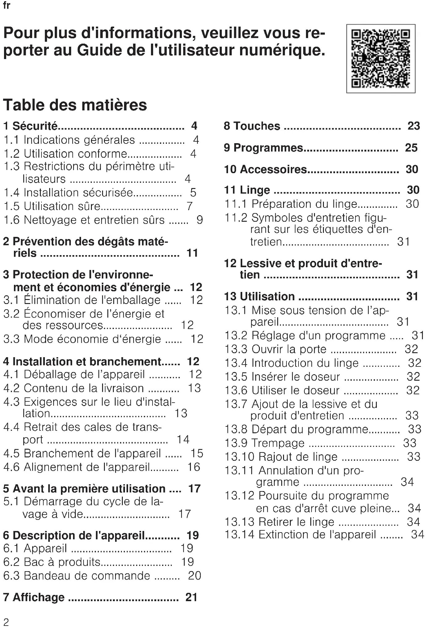 usagés (waste electrical and electronic equip- ment - WEEE). La directive définit le cadre pour une reprise et une récupération des appareils usagés appli- cables dans les pays de la CE. Service après-vente 19 Service après-vente Service après-vente Les pièces de rechange relatives au fonctionnement de l’appareil et conformes à l’ordonnance d’écocon- ception correspondante sont dispo- nibles auprès de notre service après- vente pour une durée d’au moins 10 ans à partir de la mise sur le marché de votre appareil dans l’Espace éco- nomique européen. Remarque:Dans le cadre des conditions de la garantie, le recours au service après-vente est gratuit. Pour plus d'informations sur la durée et les conditions de la garantie dans votre pays, scannez le QR code figu- rant sur le document joint afin d'obte- nir les coordonnées du service après-vente ainsi que les conditions de garantie, adressez-vous à notre service après-vente, votre revendeur ou consultez notre site web. Lorsque vous contactez le service après-vente, vous avez besoin du nu- méro de produit (E-Nr.) et du numéro de fabrication (FD) de votre appareil. Vous trouverez les coordonnées du service après-vente en scannant le QR code figurant sur le document joint relatif aux coordonnées du ser- vice après-vente et aux conditions de garantie, ou sur notre site web. 19.1 Numéro de produit (E- Nr) et numéro de fabrica- tion (FD) Le numéro de série (E-Nr.) et le nu- méro de fabrication (FD) sont indi- qués sur la plaque signalétique de l’appareil. Selon le modèle, la plaque signalétique se trouve: ¡ sur le côté intérieur du hublot. ¡ sur le côté intérieur de la trappe d'entretien. ¡ au dos de l’appareil. Pour retrouver rapidement les don- nées de votre appareil et le numéro de téléphone du service consomma- teurs, n'hésitez pas à les recopier ailleurs.fr