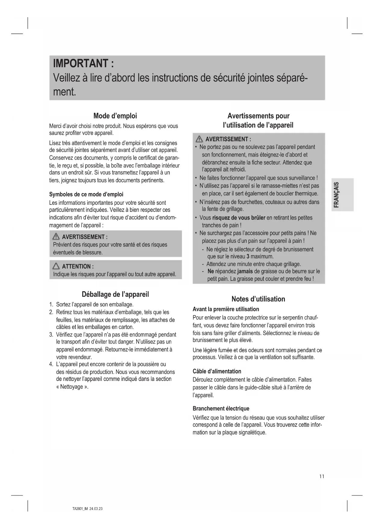 - Ne surchargez pas l’accessoire pour petits pains ! Ne placez pas plus d’un pain sur l’appareil à pain ! - Ne réglez le sélecteur de degré de brunissement que sur le niveau 3 maximum. - Attendez une minute entre chaque grillage. - Ne répandez jamais de graisse ou de beurre sur le petit pain. La graisse peut couler et prendre feu ! Notes d’utilisation Avant la première utilisation Pour enlever la couche protectrice sur le serpentin chauf- fant, vous devez faire fonctionner l’appareil environ trois fois sans faire griller d’aliments. Sélectionnez le niveau de brunissement le plus élevé. Une légère fumée et des odeurs sont normales pendant ce processus. Veillez à ce que la ventilation soit sufsante. Câble d’alimentation Déroulez complètement le câble d’alimentation. Faites passer le câble dans le guide-câble situé à l’arrière de l’appareil. Branchement électrique Vériez que la tension du réseau que vous souhaitez utiliser correspond à celle de l’appareil. Vous trouverez cette infor- mation sur la plaque signalétique.TA3801_IM 24.03.23