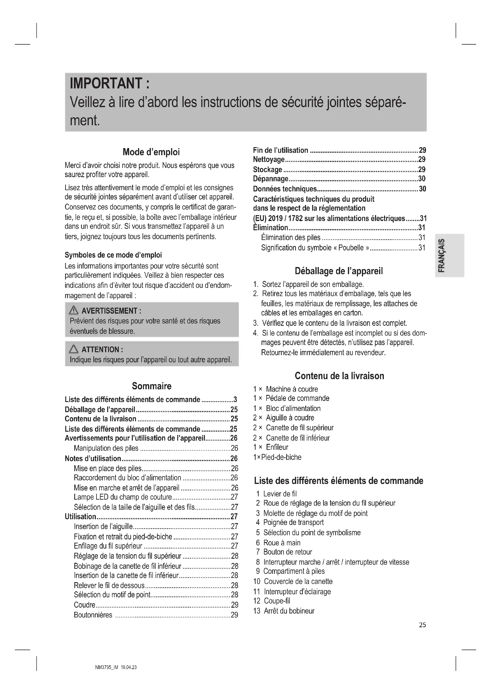 mages peuvent être détectés, n’utilisez pas l’appareil. Retournez-le immédiatement au revendeur. Contenu de la livraison 1 × Machine à coudre 1 × Pédale de commande 1 × Bloc d’alimentation 2 × Aiguille à coudre 2 × Canette de l supérieur 2 × Canette de l inférieur 1 × Enleur 1 × Pied-de-biche Liste des différents éléments de commande 1 Levier de l 2 Roue de réglage de la tension du l supérieur 3 Molette de réglage du motif de point 4 Poignée de transport 5 Sélection du point de symbolisme 6 Roue à main 7 Bouton de retour 8 Interrupteur marche / arrêt / interrupteur de vitesse 9 Compartiment à piles 10 Couvercle de la canette 11 Interrupteur d’éclairage 12 Coupe-l 13 Arrêt du bobineurNM3795_IM 19.04.23