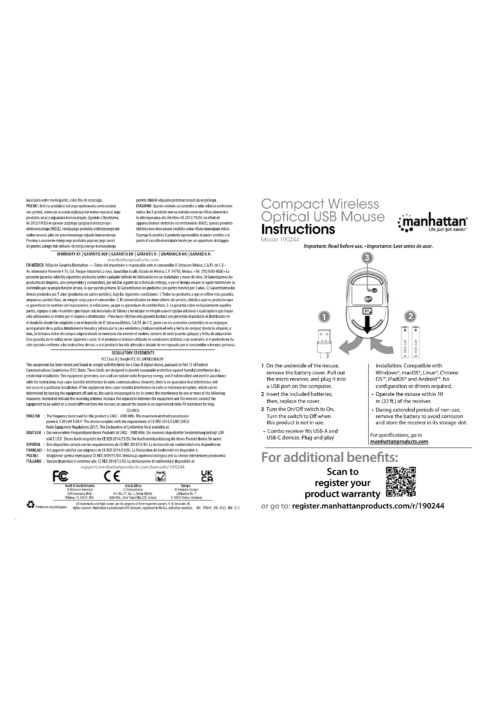 - Durante largos periodos de inactividad, retire la batería para prevenir corrosión y guarde el receptor en su ranura. Para mas especificaciones, visite manhattanproducts.com. Registre el producto en register.manhattanproducts.com/r/190244 o escanee el código QR en la cubierta. FRANÇAIS 1 Retirez le couvercle de la batterie situé sur la partie inférieure de la souris. Retirez le micro récepteur, et branchez- le dans un port USB de l’ordinateur. 2 Insérez les piles fournies, puis replacez le couvercle. 3 Positionnez l’interrupteur Marche/Arrêt sur Marche. Positionnez l’interrupteur sur Arrêt lorsque ce produit n’est pas utilisé.