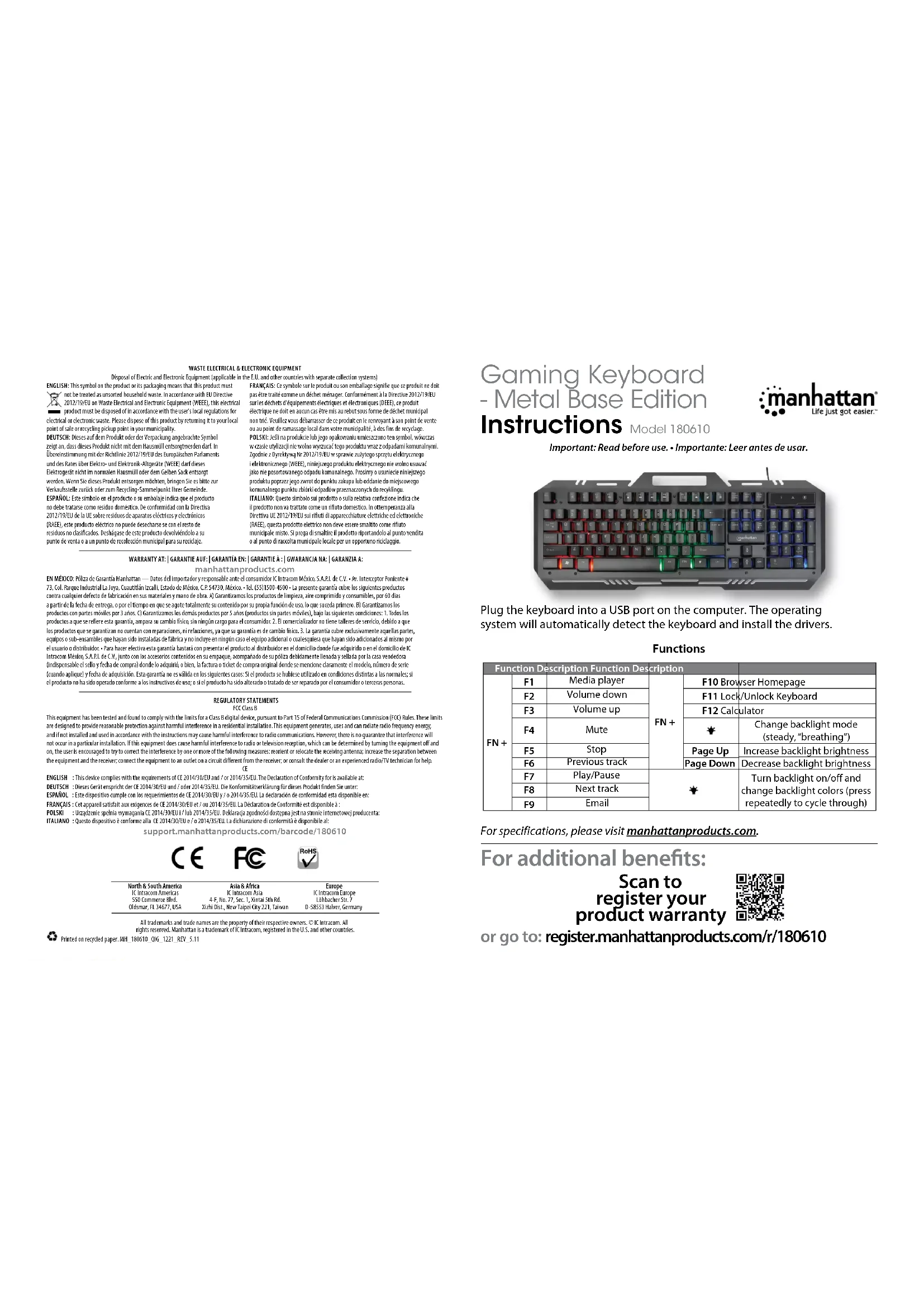 Augmenter la luminosité du rétro-éclairage Page Down Diminuer la luminosité du rétro-éclairage Activer/Désactiver le rétro-éclairage et changer les couleurs du rétro- éclairage (appuyez plusieurs fois pour faire défiler les couleurs). Vous trouvez les spécifications sur manhattanproducts.com. Enregistrez votre produit sur register. manhattanproducts.com/r/180610 ou scannez le code QR figurant sur la couverture. POLSKI Podłącz klawiaturę do wolnego portu USB w komputerze. System operacyjny automatycznie wykryje nowe urządzenie i zainstaluje odpowiednie sterowniki. Funkcje Funkcjonować Opis FN +