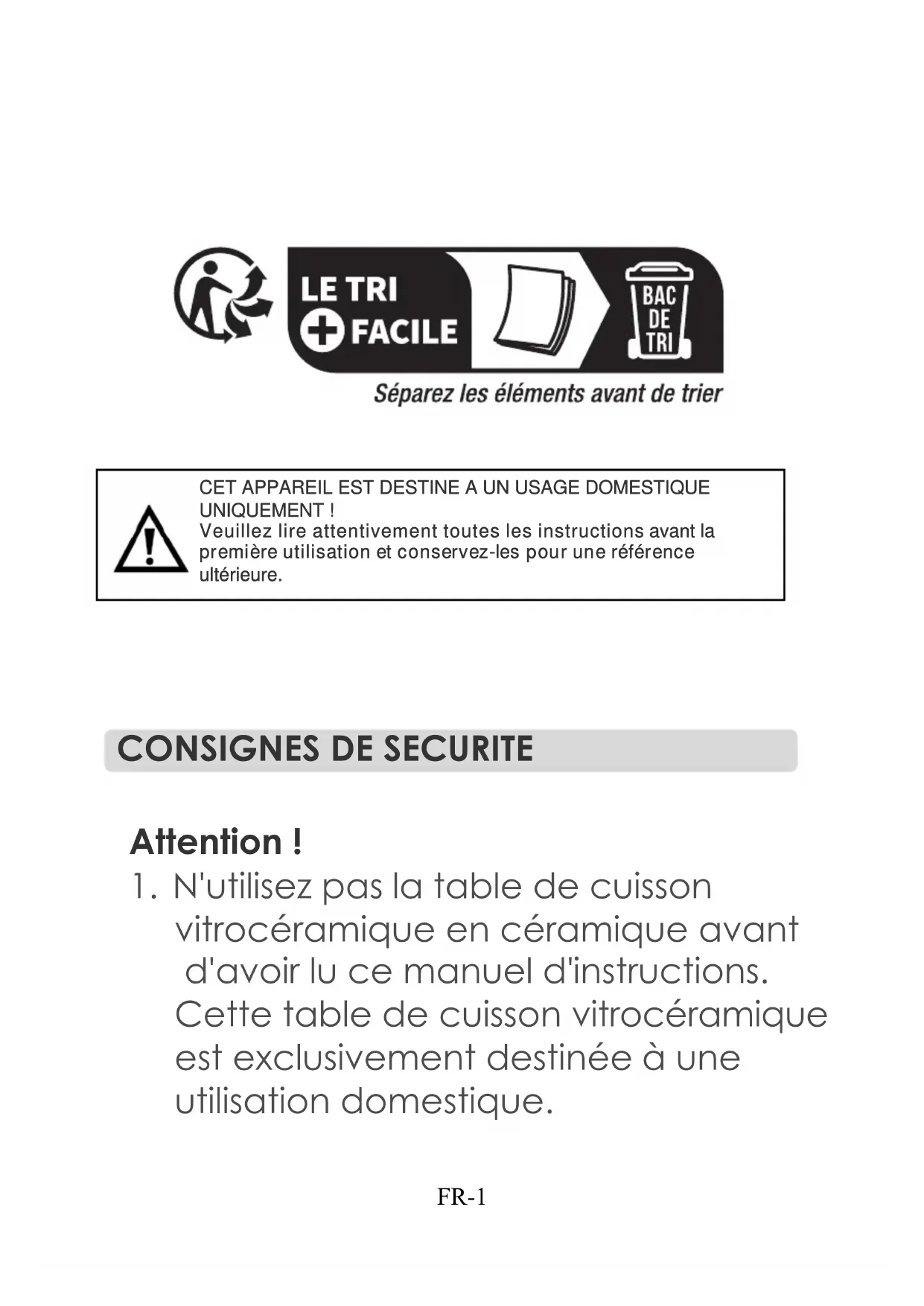 vitrocéramique en céramique avant d'avoir lu ce manuel d'instructions. Cette table de cuisson vitrocéramique est exclusivement destinée à une utilisation domestique. CET APPAREIL EST DESTINE A UN USAGE DOMESTIQUE UNIQUEMENT ! Veuillez lire attentivement toutes les instructions avant la première utilisation et conservez-les pour une référence ultérieure.FR-2