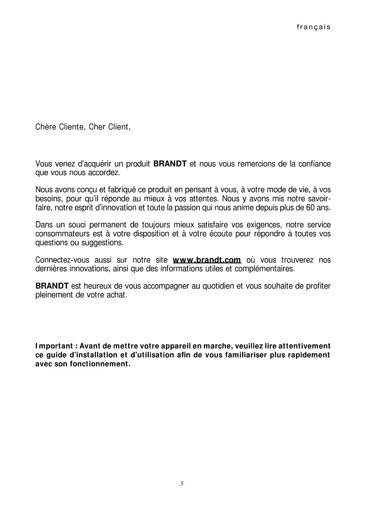 Pour en savoir plus sur nos produits ou nous contacter, vous pouvez: > consulter notre site : www.brandt.com > nous écrire à l’adresse postale suivante : Service Consommateurs BRANDT 5 avenue des Béthunes