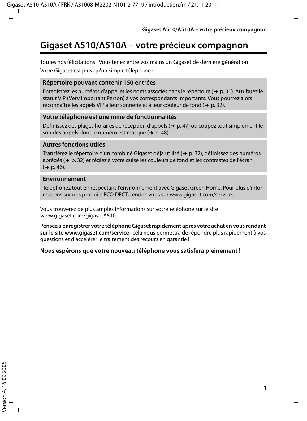 Gigaset A510-A510A / FRK / A31008-M2202-N101-2-7719 / Cover_front.fm / 08.06.2011 Félicitations En achetant un Gigaset, vous avez choisi une marque qui est synonyme de perennité. Le conditionnement de ce produit est écologique ! Pour en savoir plus : www.gigaset.com. Gigaset A510-A510A / FRK / A31008-M2202-N101-2-7719 / Cover_front.fm / Gigaset A510-A510A / FRK / A31008-M2202-N101-2-7719 / introduction.fm / 21.11.2011 Gigaset A510/A510A – votre précieux compagnon Gigaset A510/A510A – votre précieux compagnon Toutes nos félicitations ! Vous tenez entre vos mains un Gigaset de dernière génération. Votre Gigaset est plus qu'un simple téléphone : Répertoire pouvant contenir 150 entrées Enregistrez les numéros d'appel et les noms associés dans le répertoire (¢ p. 31). Attribuez le statut VIP (Very Important Person) à vos correspondants importants. Vous pourrez alors reconnaître les appels VIP à leur sonnerie et à leur couleur de fond (¢ p. 32). Votre téléphone est une mine de fonctionnalités Définissez des plages horaires de réception d'appels (¢ p. 47) ou coupez tout simplement le son des appels dont le numéro est masqué (¢ p. 48). Autres fonctions utiles Transférez le répertoire d'un combiné Gigaset déjà utilisé (¢ p. 32), définissez des numéros abrégés (¢ p. 32) et réglez à votre guise les couleurs de fond et les contrastes de l'écran (¢ p. 46). Environnement Téléphonez tout en respectant l'environnement avec Gigaset Green Home. Pour plus d'informations sur nos produits ECO DECT, rendez-vous sur www.gigaset.com/service. Vous trouverez de plus amples informations sur votre téléphone sur le site www.gigaset.com/gigasetA510. Pensez à enregistrer votre téléphone Gigaset rapidement après votre achat en vous rendant sur le site www.gigaset.com/service : cela nous permettra de répondre plus rapidement à vos questions et d'accélérer le traitement des recours en garantie ! Version 4, 16.09.2005 Nous espérons que votre nouveau téléphone vous satisfera pleinement !