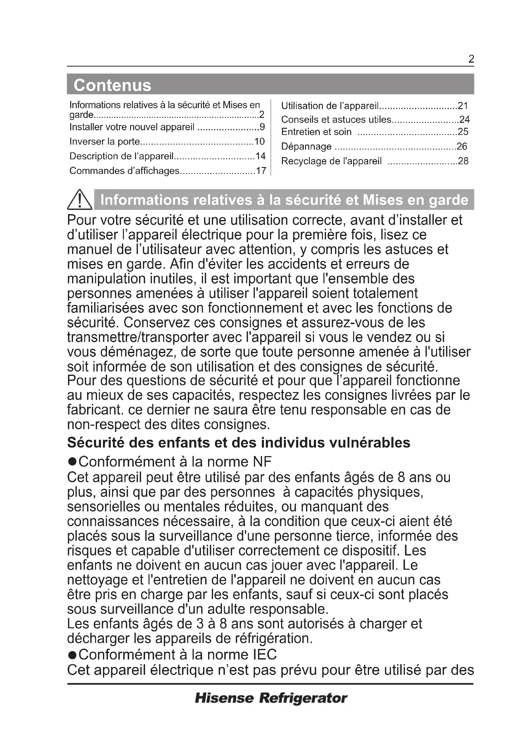Conformément à la norme NF Cet appareil peut être utilisé par des enfants âgés de 8 ans ou plus, ainsi que par des personnes à capacités physiques, sensorielles ou mentales réduites, ou manquant des connaissances nécessaire, à la condition que ceux-ci aient été placés sous la surveillance d'une personne tierce, informée des risques et capable d'utiliser correctement ce dispositif. Les enfants ne doivent en aucun cas jouer avec l'appareil. Le nettoyage et l'entretien de l'appareil ne doivent en aucun cas être pris en charge par les enfants, sauf si ceux-ci sont placés sous surveillance d'un adulte responsable. Les enfants âgés de 3 à 8 ans sont autorisés à charger et décharger les appareils de réfrigération. Conformément à la norme IEC Cet appareil électrique n’est pas prévu pour être utilisé par des