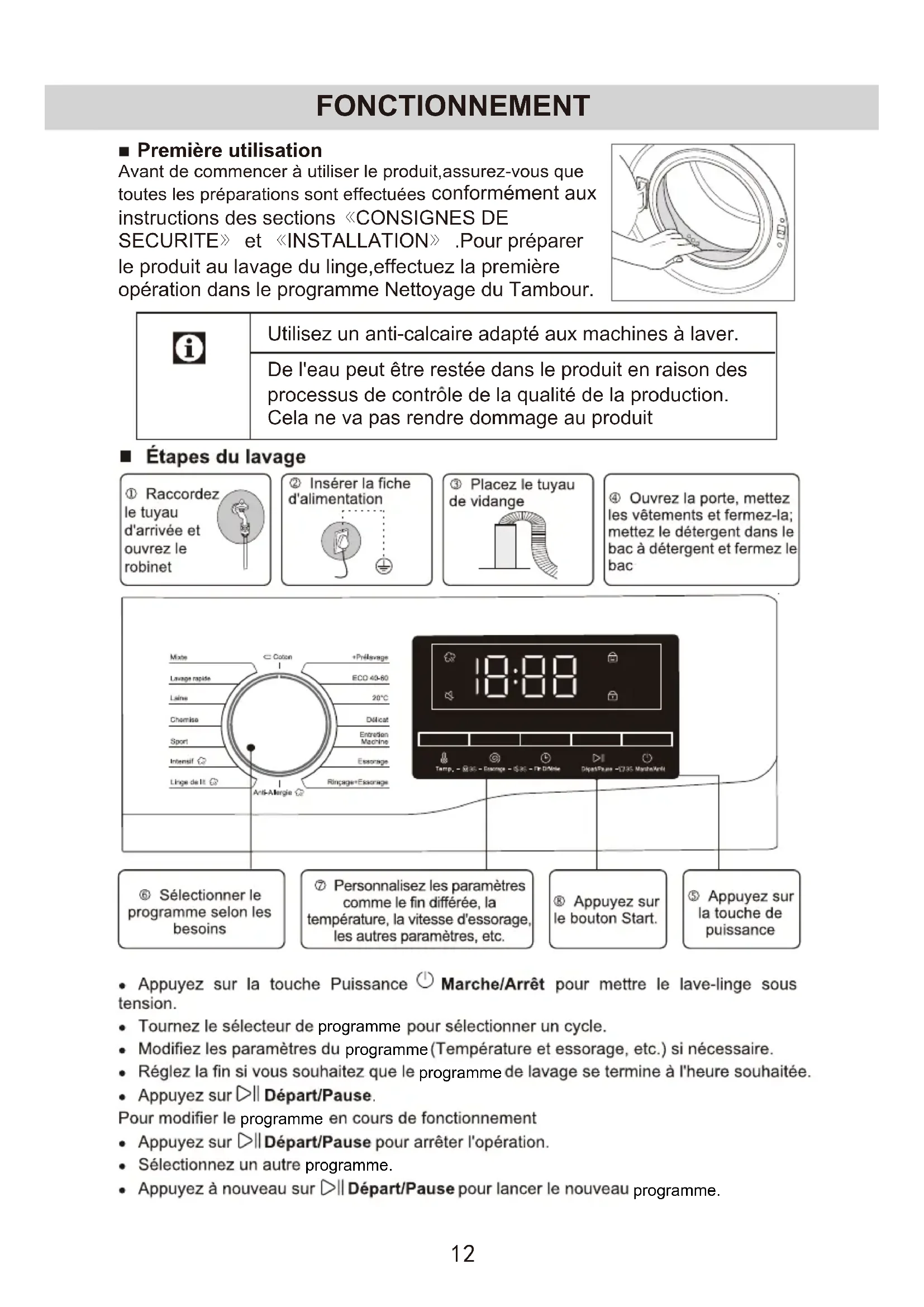 Si vous avez perdu accidentellement le manuel d'utilisation, demandez au service clientèle une copie électronique ou une copie papier.789101112 FONCTIONNEMENT Première utilisation Avant de commencer à utiliser le produit,assurez-vous que toutes les préparations sont effectuées conformément aux instructions des sections《CONSIGNES DE SECURITE》 et 《INSTALLATION》 .Pour préparer le produit au lavage du linge,effectuez la première opération dans le programme Nettoyage du Tambour. Utilisez un anti-calcaire adapté aux machines à laver. De l'eau peut être restée dans le produit en raison des processus de controle de la qualité de la production. Cela ne va pas rendre dommage au produit programme programme programme programme programme. programme.13 FONCTIONNEMENT Tri du linge Triez le linge en fonction du type de tissu, de la couleur,du degré de salissure et de la température d'eau admissible. Respectez toujours les instructions données sur les étiquettes des vêtements. Avant de mettre un vêtement ou autre article au lave-linge, veuillez consulter l'étiquette d'entretien correspondante pour conna tre les conditions de lavage et la température maximale à respecter. Préparation du linge pour le lavage Les articles de blanchisserie avec des accessoires métalliques tels que des Retirez toutes les substances des poches telles que les pièces de monnaie, soutiensgorge à armatures, des boucles de ceinture ou des boutons métalliques endommageront la machine. Retirez les pièces métalliques ou lavez les vêtements en les mettant dans un sac à linge ou une taie d'oreiller. les stylos et les trombones, puis retournez les poches et brossez. Detels objets peuvent endommager le produit ou causer des problèmes de bruit. Mettez des vêtements de petite taille tels que des chaussettes pour bébés et des bas en nylon dans un sac à linge ou une taie d'oreiller. Fermez les fermetures à glissière, cousez les boutons laches et réparez les déchirures et les ruptures. Lavez les prouduits étiquetés 《lavable en machine》 ou 《lavable à la main》 uniquement avec un programme approprié. Ne pas laver les couleurs et les blancs ensemble.Les nouveaux cotons de couleur foncée libèrent beaucoup de teinture. Lavez-les séparément. Les taches tenaces doivent être traitées correctement avant le lavage. En cas de doute, vérifiez auprès d'un nettoyeur à sec. N'utilisez que des colorants/changeurs de couleurs et des détartrants adaptés au lavage en machine.Suivez toujours les instructions sur I'emballage. Lavez les pantalons et le linge délicat à l'envers. Conservez les articles de lessive en laine angora au congélateur pendant quelques heures avant de les laver.Cela réduira le boulochage. Le linge qui est soumis à des matières telles que la farine, la poudre de chaux, le lait en poudre, etc.doit être secoué intensément avant d'être placé dans la machine. De telles poussières et poudres sur le linge peuvent s'accumuler sur les parties internes de la machine avec le temps et peuvent causer des dommages. Chargement du linge Ouvrez la porte de chargement. Placez les articles de lessive sans les serrer dans la machine. Poussez la porte de chargement pour la fermer jusqu'à ce que vous entendiez un son de verrouillage. Assurezvous qu'aucun objet n'est coincé dans la porte.14 FONCTIONNEMENT Utilisation de détergent et d'adoucissant Lors de l'utilisation de détergent, d'adoucissant,d'amidon,de teinture textile, d'eau de Javel ou de détartrant, lisez attentivement les instructions du fabricant sur l'emballage et suivez les valeurs de dosage suggérées. Utilisez une tasse à mesurer si disponible. La porte de chargement est verrouillée pendant I'exécution d'un programme. Seulement après quelques