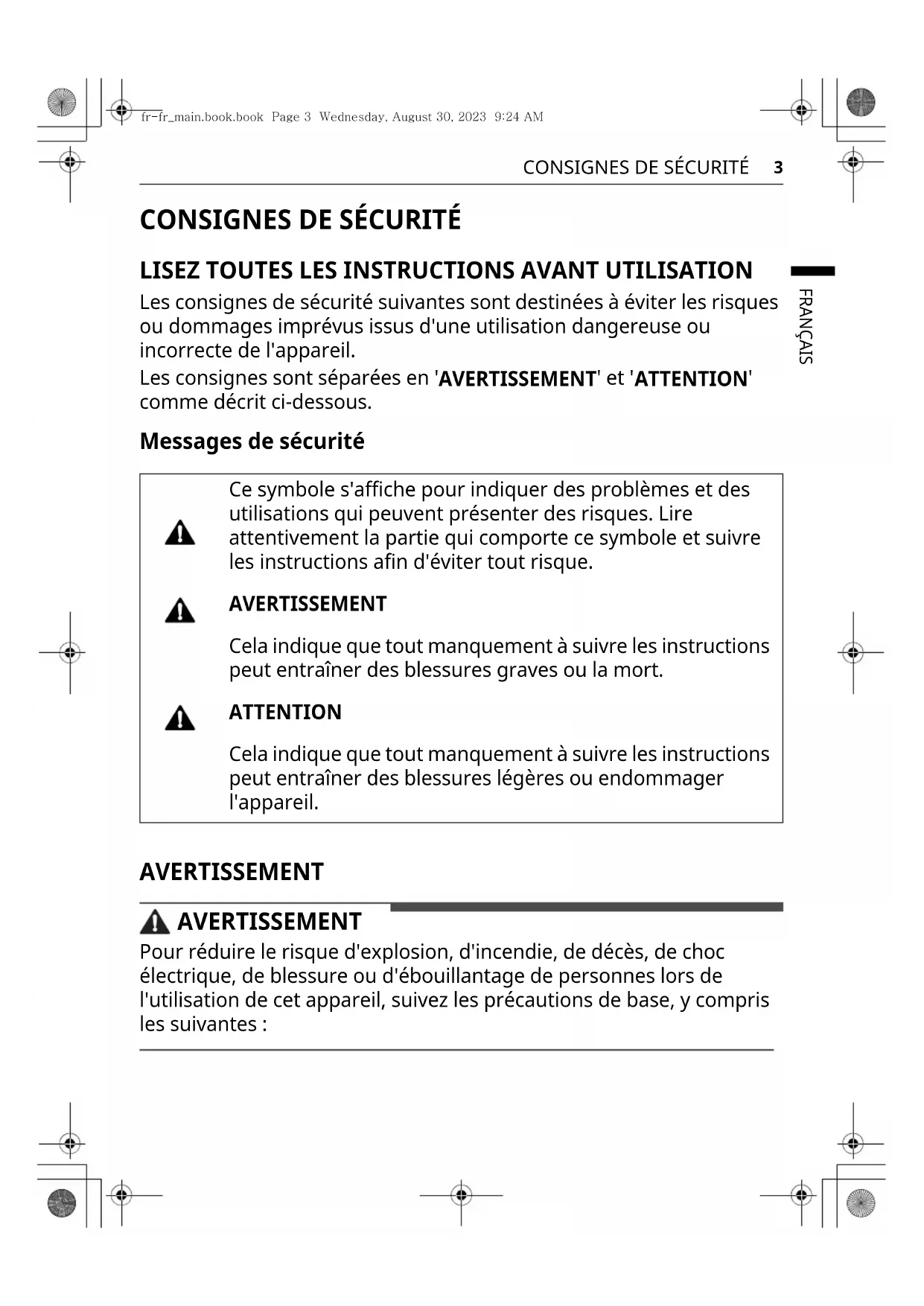 comme décrit ci-dessous. Messages de sécurité AVERTISSEMENT AVERTISSEMENT Pour réduire le risque d'explosion, d'incendie, de décès, de choc électrique, de blessure ou d'ébouillantage de personnes lors de l'utilisation de cet appareil, suivez les précautions de base, y compris les suivantes : Ce symbole s'affiche pour indiquer des problèmes et des utilisations qui peuvent présenter des risques. Lire attentivement la partie qui comporte ce symbole et suivre les instructions afin d'éviter tout risque. AVERTISSEMENT Cela indique que tout manquement à suivre les instructions peut entraîner des blessures graves ou la mort. ATTENTION Cela indique que tout manquement à suivre les instructions peut entraîner des blessures légères ou endommager l'appareil. fr-fr_main.book.book Page 3 Wednesday, August 30, 2023 9:24 AM4