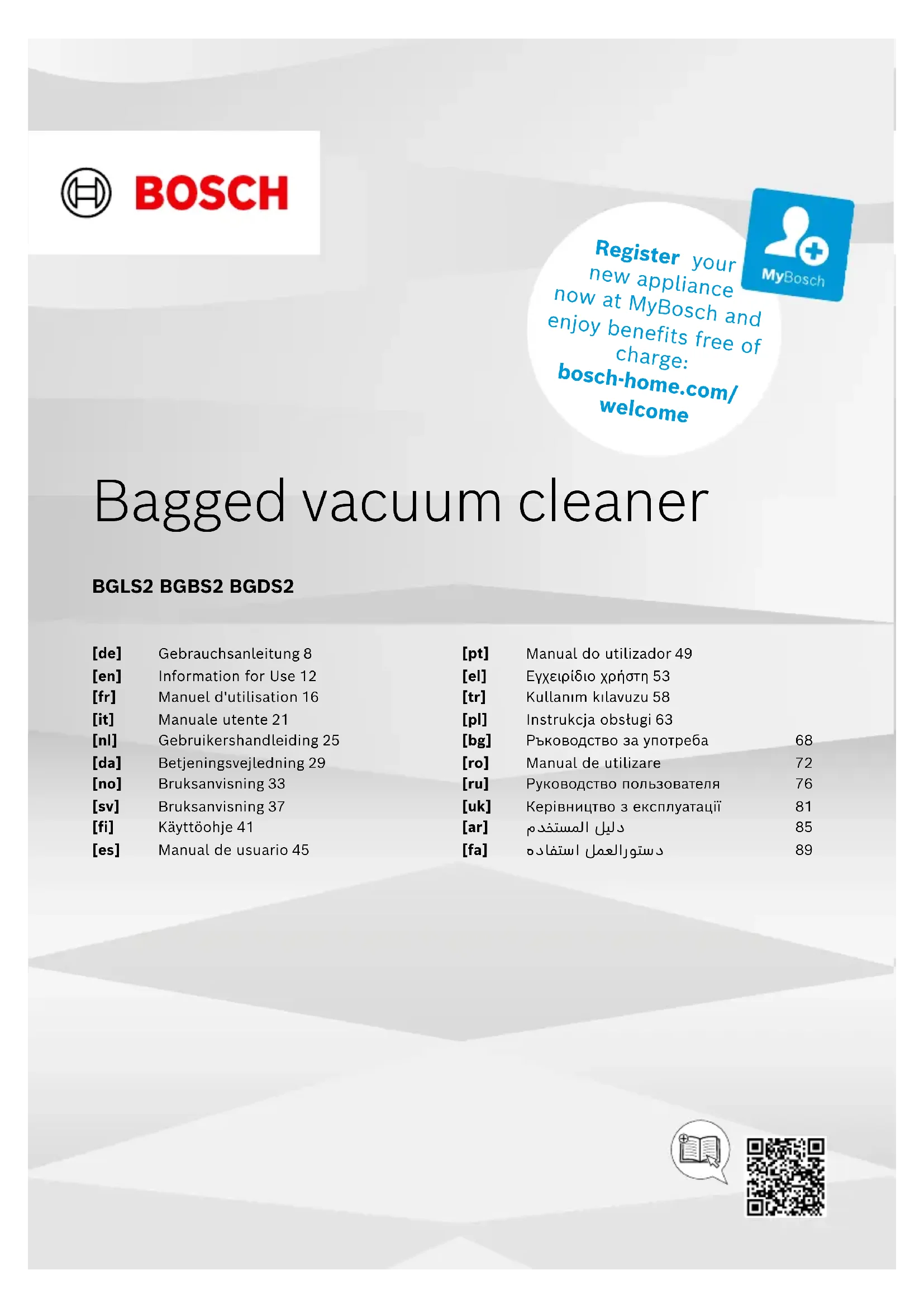 Depending on the appliance specifications 14Customer Service en This appliance is labelled in accordance with European Directive 2012/19/EU con- cerning used electrical and electronic appliances (waste electrical and electronic equipment - WEEE). The guideline determines the framework for the return and recycling of used appliances as applicable throughout the EU. Customer ServiceCustomer Service You can obtain function-relevant and stor- able genuine spare parts from our Cus- tomer Service for up to 10years from the date on which your appliance was placed on the market. For more information, please contact our Customer Service team. Detailed information about the warranty period and the warranty conditions in your country is available via the QR code on the enclosed document on service contacts and warranty conditions, from our customer service or on our website. You can find the contact details for our cus- tomer service via the QR code on the en- closed document on service contacts and warranty conditions or on our website. You can find the information required as per Regulation (EU) 2023/826 online at www.bosch-home.com on the product and service pages for your appliance, in the area of user manuals and additional docu- ments. Information on the Ecodesign RegulationInformation on the Ecodesign Regulation This vacuum cleaner is a household va- cuum cleaner classed as a general pur- pose vacuum cleaner. Use the interchangeable universal nozzle for cleaning carpets. For cleaning hard floors, use the hard floor nozzle designed for cleaning hard floors and test crevices, if supplied. The performance data for this appliance is based on the measurement and calculation methods specified in Regulation (EU) No666/2013 and the standards EN60312-1, EN60704-2-1, EN60335-2-2. 15fr Sécurité Sécurité Sécurité ¡ Lisez attentivement cette notice. ¡ Conservez la notice ainsi que les informations produit en vue d’une réutilisation ultérieure ou pour un futur nouveau proprié- taire. ¡ Ne branchez pas l’appareil si ce dernier a été endommagé du- rant le transport. Utilisez l‘appareil uniquement: ¡ avec des pièces et accessoires d’origine. En cas de dommages dus à l’utilisation de produits tiers, le droit à la garantie expire. ¡ pour nettoyer les surfaces. ¡ pour un usage domestique privé et dans les pièces fermées d’un domicile, à la température ambiante. ¡ jusqu'à une altitude maximale de 2000m au-dessus du niveau de la mer. N’utilisez pas l’appareil: ¡ pour l’aspiration de personnes et d’animaux. ¡ pour l’aspiration de substances nocives pour la santé, aux arêtes vives, chaudes ou brûlantes. ¡ pour l’aspiration de substances humides ou liquides. ¡ pour l’aspiration de substances et gaz légèrement inflammables ou explosibles. ¡ pour l’aspiration de cendres, de la suie de four et d’installations de chauffage central. ¡ pour l’aspiration de poussières de toner des imprimantes et co- pieurs. ¡ pour l’aspiration de débris de construction. Débranchez l’appareil du secteur lorsque: ¡ vous nettoyez l’appareil. Les enfants de 8 ans et plus, les personnes souffrant d’un handi- cap physique, sensoriel ou mental ou ne détenant pas l’expérience et/ou les connaissances nécessaires pourront utiliser cet appareil à condition de le faire sous surveillance, ou que son utilisation sûre leur ait été enseignée et qu’ils aient compris les dangers qui en émanent. Les enfants ne sont pas autorisés à jouer avec l'appareil. 16Sécurité fr Le nettoyage de l’appareil, et l’entretien par l’utilisateur, sont des activités que les enfants ne peuvent pas effectuer sans sur- veillance. Seul un personnel dûment qualifié peut entreprendre des répara- tions sur l'appareil. Seules des pièces de rechange d'origine peuvent être utilisées pour réparer l'appareil. Afin d’écarter tout danger quand le cordon d’alimentation sec- teur de cet appareil est endommagé, seul le fabricant ou son service après-vente ou toute autre personne de qualification équivalente est habilité à le remplacer. N'utilisez jamais un appareil endommagé. Ne jamais faire fonctionner l’appareil avec une surface fissurée ou cassée. Ne tirez jamais sur le cordon d'alimentation secteur pour débran- cher l'appareil du secteur. Débranchez toujours la fiche du cor- don d'alimentation secteur. Ne tirez et ne transportez jamais l'appareil par le cordon d'ali- mentation secteur. Si l'appareil ou le cordon d'alimentation secteur est endommagé, débranchez immédiatement le cordon d'alimentation secteur ou coupez le fusible dans le boîtier à fusibles. Appelez le service après-vente.