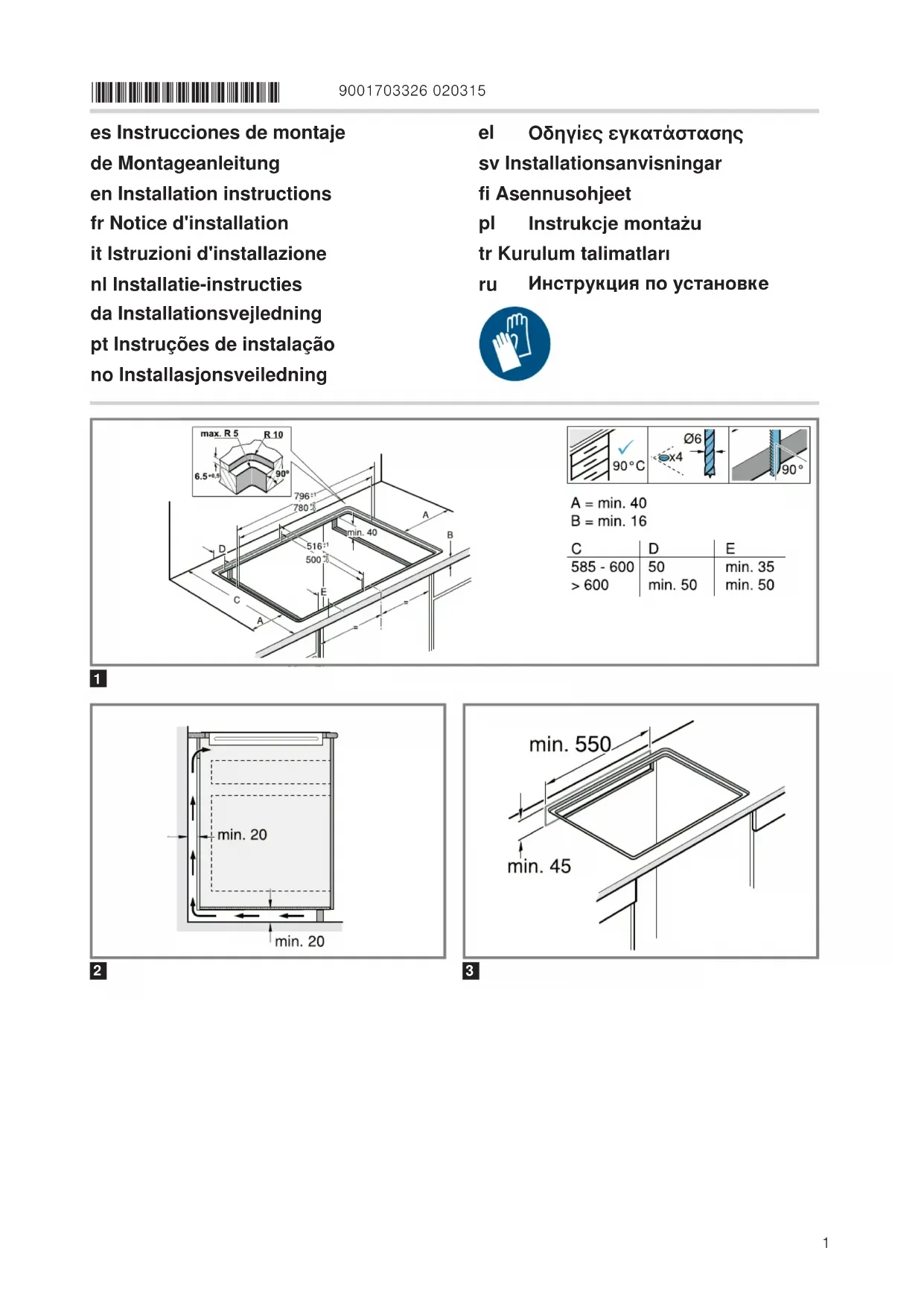 de montage. ‒ Veiller à ce que l'angle du chant de la découpe par rapport au plan de travail soit de 90°.