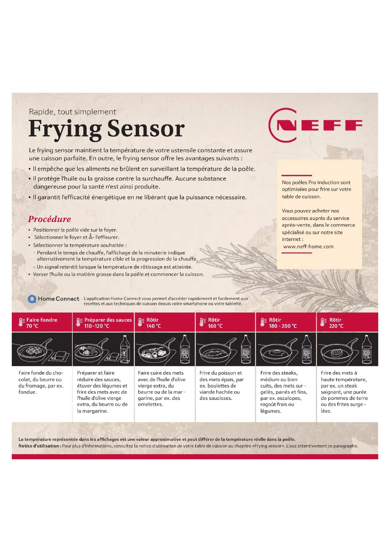 - Il garantit l'efcacité énergétique en ne libérant que la puissance nécessaire. Rapide, tout simplement Frying Sensor Nos poêles Pro Induction sont optimisées pour frire sur votre table de cuisson.Vous pouvez acheter nos accessoires auprès du service après-vente, dans le commerce spécialisé ou sur notre site internet: www.ne-home.com Procédure