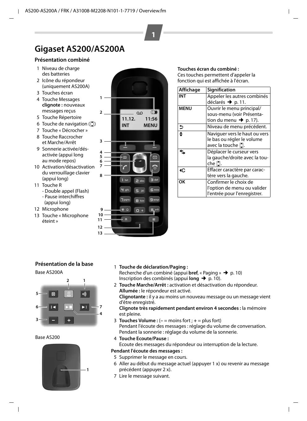 1 AS200-AS200A / FRK / A31008-M2208-N101-1-7719 / Overview.fm Gigaset AS200/AS200A Présentation combiné Niveau de charge des batteries Icône du répondeur {uniquement AS200A) Touches écran Touche Messages clignote : nouveaux messages reçus Touche Répertoire Touche de navigation ([9]) Touche « Décrocher » Touche Raccrocher et Marche/Arrêt 9 Sonnerie activée/dés- activée (appui long au mode repos) 10 Activation/désactivation du verrouillage clavier (appui long) Touche R - Double appel (Flash) - Pause interchiffres (appui long) 12 Microphone 13 Touche « Microphone éteint»