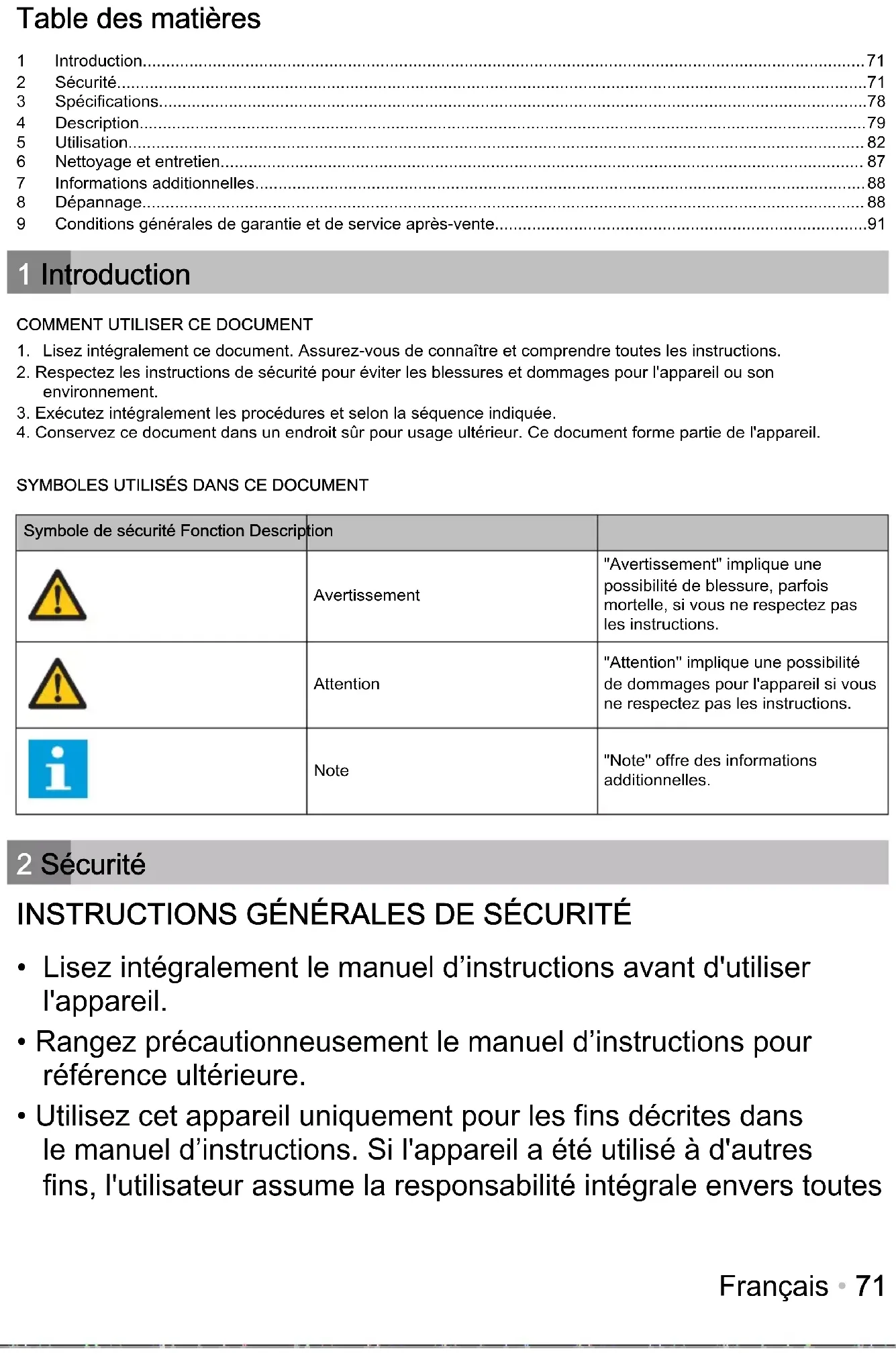 Symbole de sécurité Fonction Description Avertissement "Avertissement" implique une possibilité de blessure, parfois mortelle, si vous ne respectez pas les instructions. Attention "Attention" implique une possibilité de dommages pour l'appareil si vous ne respectez pas les instructions. Note "Note" offre des informations additionnelles. 2 Sécurité INSTRUCTIONS GÉNÉRALES DE SÉCURITÉ