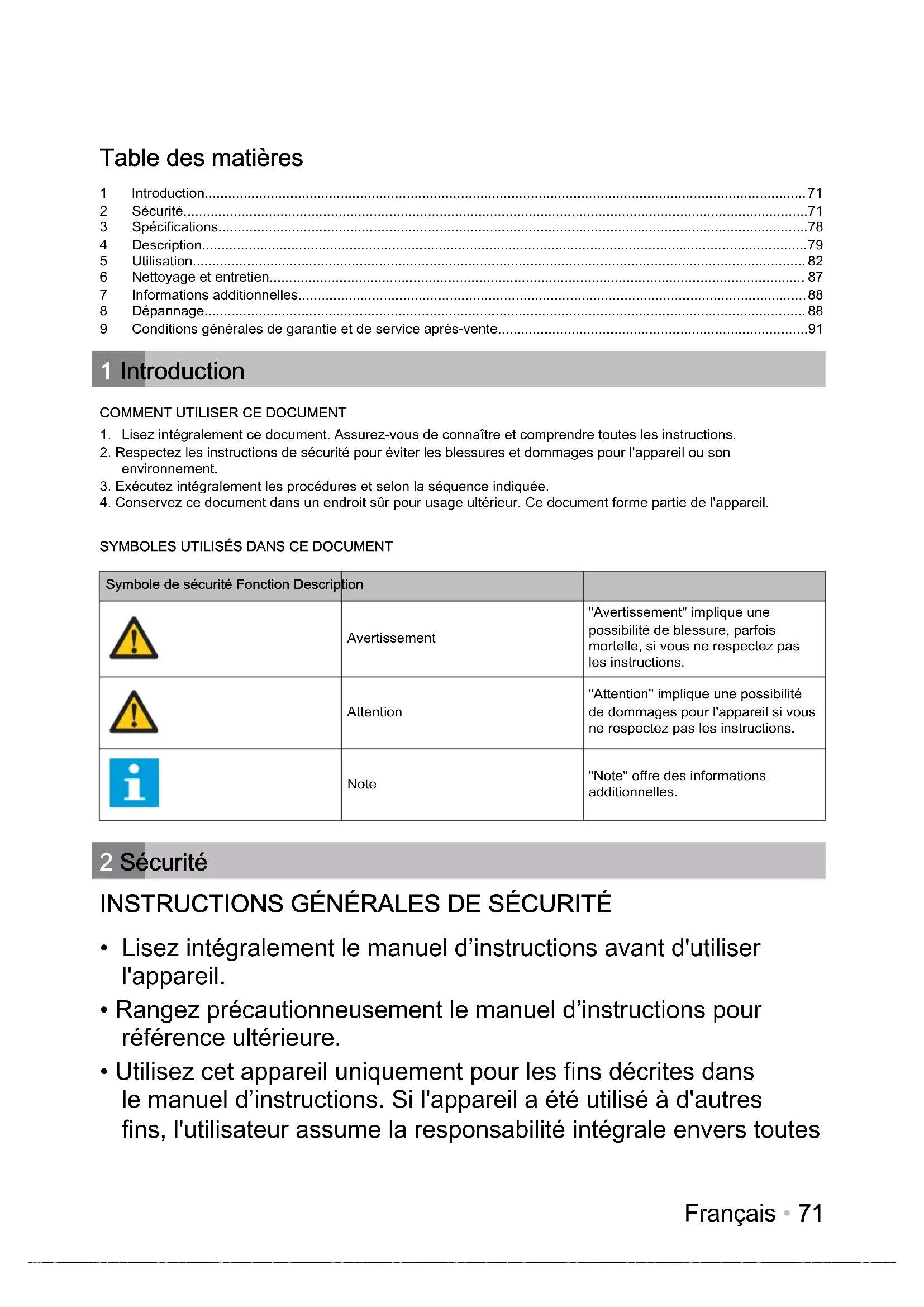 Symbole de sécurité Fonction Description Avertissement "Avertissement" implique une possibilité de blessure, parfois mortelle, si vous ne respectez pas les instructions. Attention "Attention" implique une possibilité de dommages pour l'appareil si vous ne respectez pas les instructions. Note "Note" offre des informations additionnelles. 2 Sécurité INSTRUCTIONS GÉNÉRALES DE SÉCURITÉ