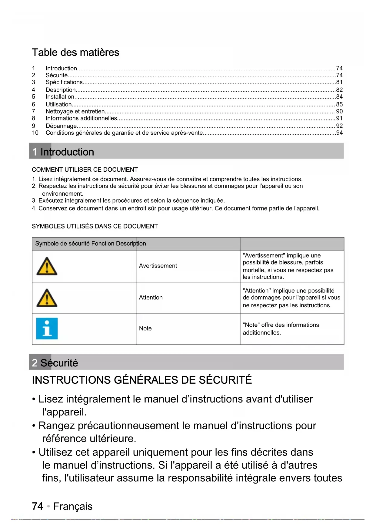 Symbole de sécurité Fonction Description Avertissement "Avertissement" implique une possibilité de blessure, parfois mortelle, si vous ne respectez pas les instructions. Attention "Attention" implique une possibilité de dommages pour l'appareil si vous ne respectez pas les instructions. Note "Note" offre des informations additionnelles. 2 Sécurité INSTRUCTIONS GÉNÉRALES DE SÉCURITÉ