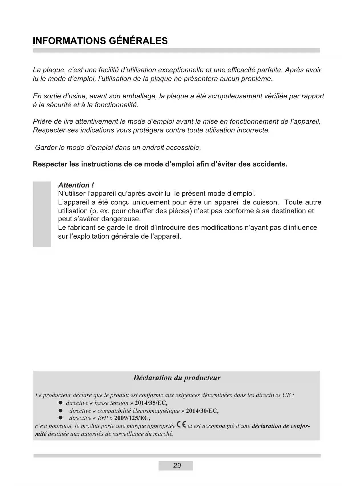 niert nicht, die Kochzonen können nicht eingeschaltet oder bedient werden. - Fehler der Elektronik - Das Kochfeld neu starten, für ein paar Minuten vom Stromnetz trennen (Siche- rung herausnehmen). Nennspannung 220-240V~50/60 Hz Nennleistung der Kochfelder: 3,7kW - Induktionskochzone : -Induktionskochzone Booster: Ø 160 mm 1200/1400 W -Induktionskochzone Booster: Ø 210 mm 2000/3000 W Abmessungen 300 x 522 x 60;; Gewicht ca.5,5 kg; Erfüllt die Anforderungen der Normen EN 60335-1; EN 60335-2-6, die in der Europäischen Union gelten. TECHNISCHE DATEN29 Attention ! N’utiliser l’appareil qu’après avoir lu le présent mode d’emploi. L’appareil a été conçu uniquement pour être un appareil de cuisson. Toute autre utilisation (p. ex. pour chauer des pièces) n’est pas conforme à sa destination et peut s’avérer dangereuse. Le fabricant se garde le droit d’introduire des modications n’ayant pas d’inuence sur l’exploitation générale de l’appareil. Déclaration du producteur Le producteur déclare que le produit est conforme aux exigences déterminées dans les directives UE : directive « basse tension » 2014/35/EC, directive « compatibilité électromagnétique » 2014/30/EC, directive « ErP » 2009/125/EC, c’est pourquoi, le produit porte une marque appropriée et est accompagné d’une déclaration de confor- mité destinée aux autorités de surveillance du marché. La plaque, c’est une facilité d’utilisation exceptionnelle et une ecacité parfaite. Après avoir lu le mode d’emploi, l’utilisation de la plaque ne présentera aucun problème. En sortie d’usine, avant son emballage, la plaque a été scrupuleusement vériée par rapport à la sécurité et à la fonctionnalité. Prière de lire attentivement le mode d’emploi avant la mise en fonctionnement de l’appareil. Respecter ses indications vous protégera contre toute utilisation incorrecte. Garder le mode d’emploi dans un endroit accessible. Respecter les instructions de ce mode d’emploi an d’éviter des accidents.