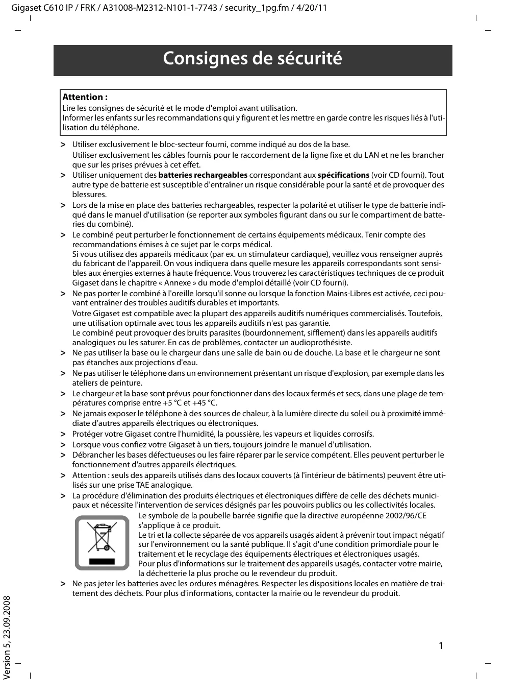 Utiliser exclusivement les câbles fournis pour le raccordement de la ligne fixe et du LAN et ne les brancher que sur les prises prévues à cet effet. Utiliser uniquement des batteries rechargeables correspondant aux spécifications (voir CD fourni). Tout autre type de batterie est susceptible d'entraîner un risque considérable pour la santé et de provoquer des blessures. Lors de la mise en place des batteries rechargeables, respecter la polarité et utiliser le type de batterie indiqué dans le manuel d'utilisation (se reporter aux symboles figurant dans ou sur le compartiment de batteries du combiné). Le combiné peut perturber le fonctionnement de certains équipements médicaux. Tenir compte des recommandations émises à ce sujet par le corps médical. Si vous utilisez des appareils médicaux (par ex. un stimulateur cardiaque), veuillez vous renseigner auprès du fabricant de l'appareil. On vous indiquera dans quelle mesure les appareils correspondants sont sensibles aux énergies externes à haute fréquence. Vous trouverez les caractéristiques techniques de ce produit Gigaset dans le chapitre « Annexe » du mode d'emploi détaillé (voir CD fourni). Ne pas porter le combiné à l'oreille lorsqu'il sonne ou lorsque la fonction Mains-Libres est activée, ceci pouvant entraîner des troubles auditifs durables et importants. Votre Gigaset est compatible avec la plupart des appareils auditifs numériques commercialisés. Toutefois, une utilisation optimale avec tous les appareils auditifs n'est pas garantie. Le combiné peut provoquer des bruits parasites (bourdonnement, sifflement) dans les appareils auditifs analogiques ou les saturer. En cas de problèmes, contacter un audioprothésiste. Ne pas utiliser la base ou le chargeur dans une salle de bain ou de douche. La base et le chargeur ne sont pas étanches aux projections d'eau. Ne pas utiliser le téléphone dans un environnement présentant un risque d'explosion, par exemple dans les ateliers de peinture. Le chargeur et la base sont prévus pour fonctionner dans des locaux fermés et secs, dans une plage de températures comprise entre +5 °C et +45 °C. Ne jamais exposer le téléphone à des sources de chaleur, à la lumière directe du soleil ou à proximité immédiate d’autres appareils électriques ou électroniques. Protéger votre Gigaset contre l'humidité, la poussière, les vapeurs et liquides corrosifs. Lorsque vous confiez votre Gigaset à un tiers, toujours joindre le manuel d'utilisation. Débrancher les bases défectueuses ou les faire réparer par le service compétent. Elles peuvent perturber le fonctionnement d'autres appareils électriques. Attention : seuls des appareils utilisés dans des locaux couverts (à l'intérieur de bâtiments) peuvent être utilisés sur une prise TAE analogique. La procédure d'élimination des produits électriques et électroniques diffère de celle des déchets municipaux et nécessite l'intervention de services désignés par les pouvoirs publics ou les collectivités locales. Le symbole de la poubelle barrée signifie que la directive européenne 2002/96/CE s'applique à ce produit. Le tri et la collecte séparée de vos appareils usagés aident à prévenir tout impact négatif sur l'environnement ou la santé publique. Il s'agit d'une condition primordiale pour le traitement et le recyclage des équipements électriques et électroniques usagés. Pour plus d'informations sur le traitement des appareils usagés, contacter votre mairie, la déchetterie la plus proche ou le revendeur du produit. Ne pas jeter les batteries avec les ordures ménagères. Respecter les dispositions locales en matière de traitement des déchets. Pour plus d'informations, contacter la mairie ou le revendeur du produit.