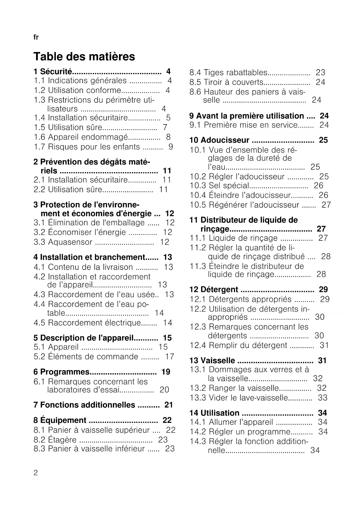 1.4 Installation sécuritaire AVERTISSEMENT‒Risque de blessure! Une installation inadéquate peut occasionner des blessures. ▶ Lors de l’installation et du raccordement de l’appareil, suivez les instructions figurant dans la notice d’utilisation et les instructions de montage. AVERTISSEMENT‒Risque d'électrocution! Les installations non conformes sont dangereuses. ▶ Pour le raccordement et l’utilisation de l’appareil, respectez im- pérativement les indications figurant sur la plaque signalétique. ▶ Toujours utiliser le cordon d'alimentation secteur fourni du nou- vel appareil. ▶ L’appareil doit être branché uniquement à une source d'alimen- tation avec courant alternatif à l'aide d'une prise murale correc- tement installée et reliée à la terre. ▶ Le système à conducteur de protection de l’installation élec- trique de la maison doit être conforme. ▶ N'alimentez jamais l'appareil par l'intermédiaire d'un appareil de commutation externe, par ex. une minuterie ou une télécom- mande. ▶ Si l’appareil est encastré, la fiche du cordon d’alimentation sec- teur doit être librement accessible ou, si un accès libre est im- possible, un dispositif de sectionnement doit être installé dans l’installation électrique fixe, conformément aux réglementations d’installation. ▶ Lors de l’installation de l’appareil, veiller à ce que le cordon d’alimentation secteur ne soit pas coincé ni endommagé. Il est dangereux de sectionner le flexible d’arrivée ou d’immerger la vanne Aquastop dans l’eau. ▶ N’immergez jamais le boîtier de plastique dans l’eau. Le boîtier en plastique du flexible d’arrivée contient une vanne électrique. ▶ Ne sectionnez jamais le flexible d’arrivée. Dans le flexible d’arri- vée d’eau se trouvent des lignes d’alimentation électrique.fr Sécurité