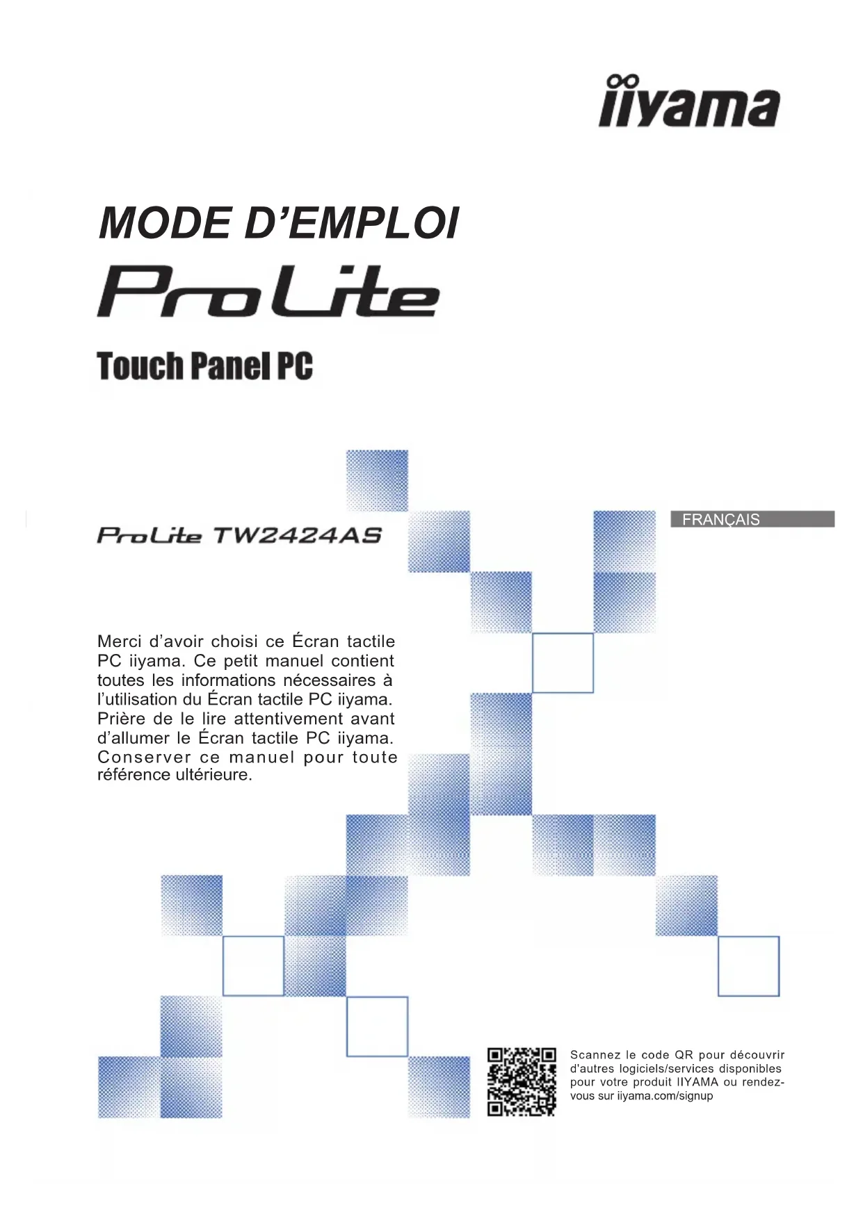 Merci d’avoir choisi ce Écran tactile PC iiyama. Ce petit manuel contient toutes les informations nécessaires à l’utilisation du Écran tactile PC iiyama. Prière de le lire attentivement avant d’allumer le Écran tactile PC iiyama. Conserver ce manuel pour toute référence ultérieure. Scannez le code QR pour découvrir d'autres logiciels/services disponibles pour votre produit IIYAMA ou rendez- vous sur iiyama.com/signupFRANÇAIS