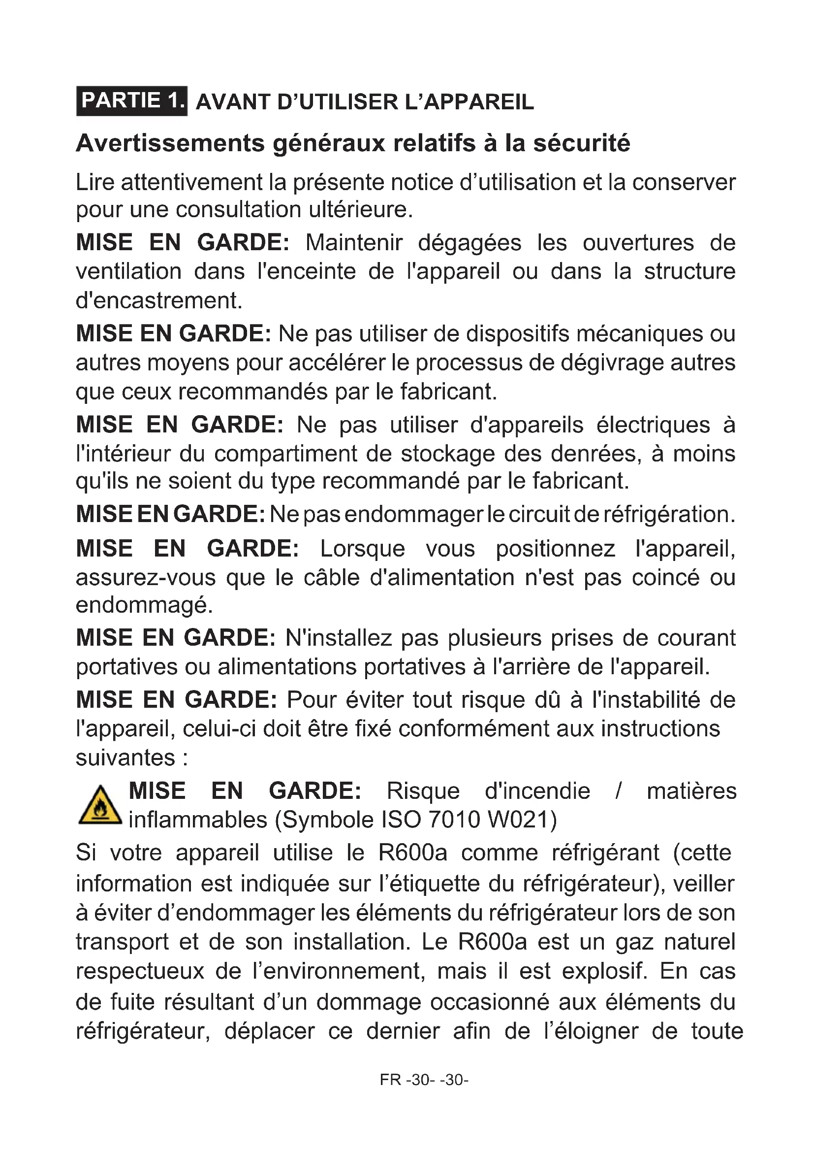 Avertissements généraux relatifs à la sécurité Lire attentivement la présente notice d’utilisation et la conserver pour une consultation ultérieure. MISE EN GARDE: Maintenir dégagées les ouvertures de ventilation dans l'enceinte de l'appareil ou dans la structure d'encastrement. MISE EN GARDE: Ne pas utiliser de dispositifs mécaniques ou autres moyens pour accélérer le processus de dégivrage autres que ceux recommandés par le fabricant. MISE EN GARDE: Ne pas utiliser d'appareils électriques à l'intérieur du compartiment de stockage des denrées, à moins qu'ils ne soient du type recommandé par le fabricant. MISE EN GARDE: Ne pas endommager le circuit de réfrigération. MISE EN GARDE: Lorsque vous positionnez l'appareil, assurezvous que le câble d'alimentation n'est pas coincé ou endommagé. MISE EN GARDE: N'installez pas plusieurs prises de courant portatives ou alimentations portatives à l'arrière de l'appareil. MISE EN GARDE: Pour éviter tout risque dû à l'instabilité de l'appareil, celui-ci doit être xé conformément aux instructions suivantes : MISE EN GARDE: Risque d'incendie / matières inammables (Symbole ISO 7010 W021) Si votre appareil utilise le R600a comme réfrigérant (cette information est indiquée sur l’étiquette du réfrigérateur), veiller à éviter d’endommager les éléments du réfrigérateur lors de son transport et de son installation. Le R600a est un gaz naturel respectueux de l’environnement, mais il est explosif. En cas de fuite résultant d’un dommage occasionné aux éléments du réfrigérateur, déplacer ce dernier an de l’éloigner de touteFR 31 31 amme nue ou source de chaleur et aérer la pièce où se trouve l’appareil pendant quelques minutes.