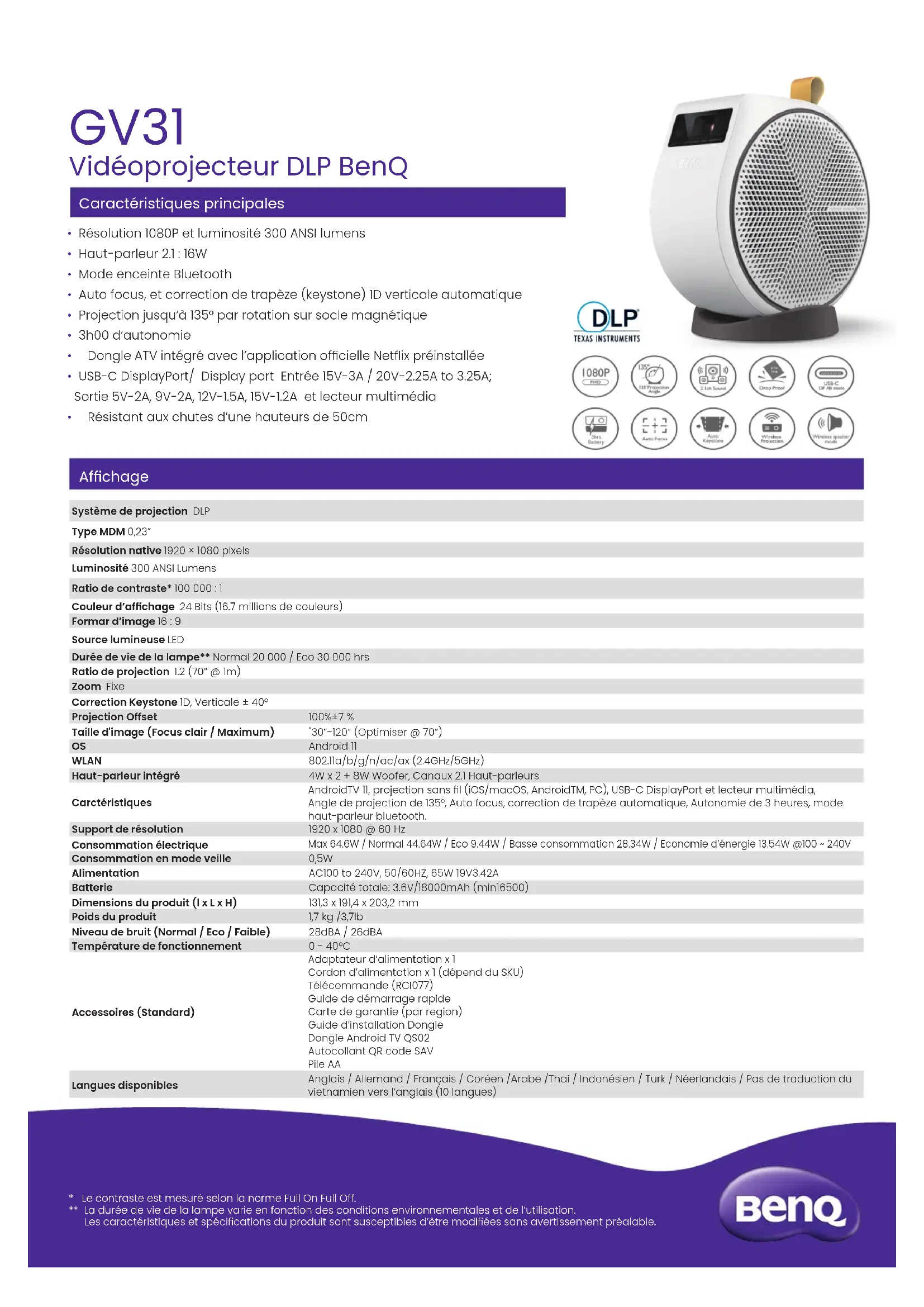 | Technologie d'affichage | DLP |