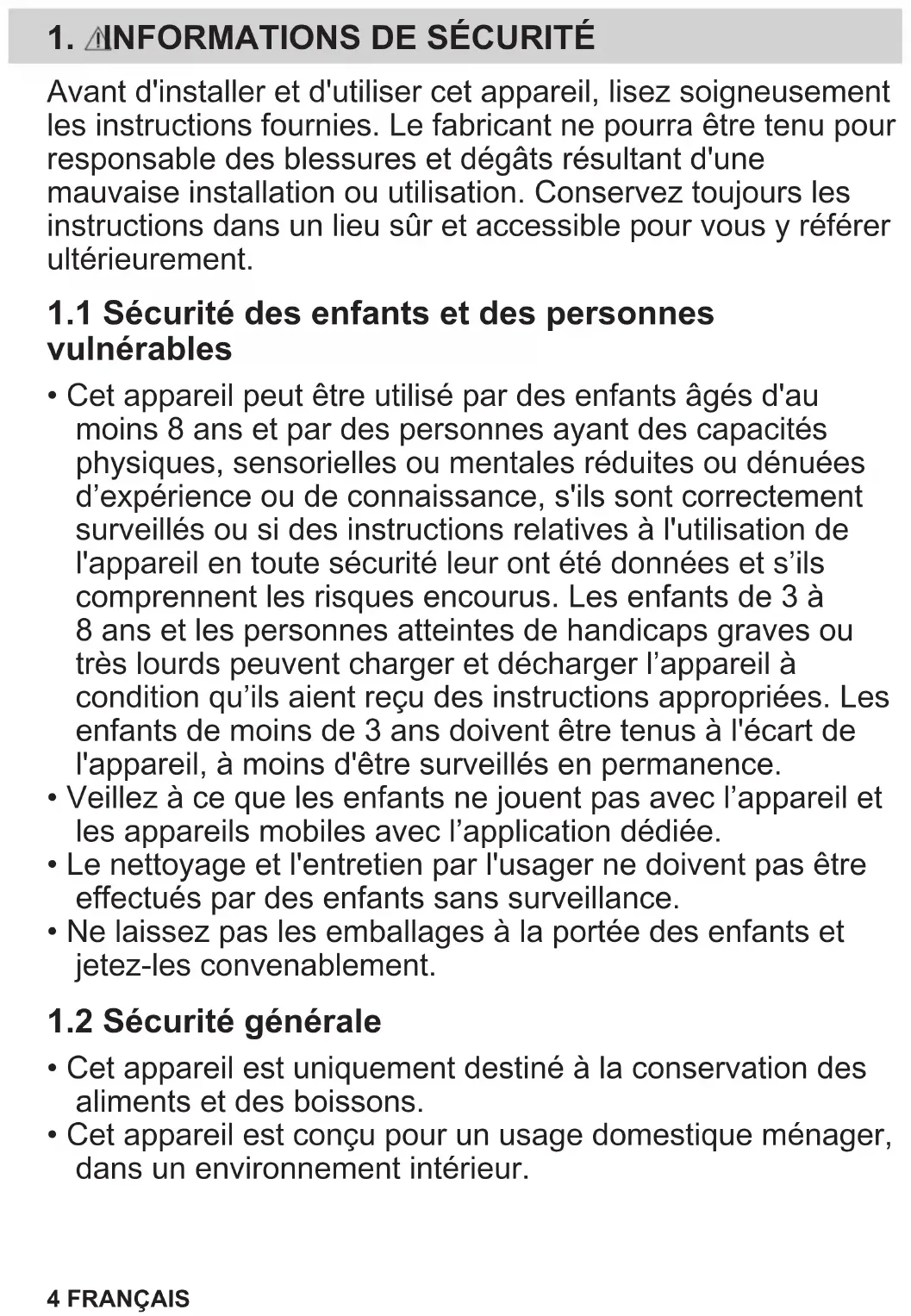 - Cet appareil peut être utilisé par des enfants âgés d'au moins 8 ans et par des personnes ayant des capacités physiques, sensorielles ou mentales réduites ou dénuées d’expérience ou de connaissance, s'ils sont correctement surveillés ou si des instructions relatives à l'utilisation de l'appareil en toute sécurité leur ont été données et s’ils comprennent les risques encourus. Les enfants de 3 à 8 ans et les personnes atteintes de handicaps graves ou très lourds peuvent charger et décharger l’appareil à condition qu’ils aient reçu des instructions appropriées. Les enfants de moins de 3 ans doivent être tenus à l'écart de l'appareil, à moins d'être surveillés en permanence.