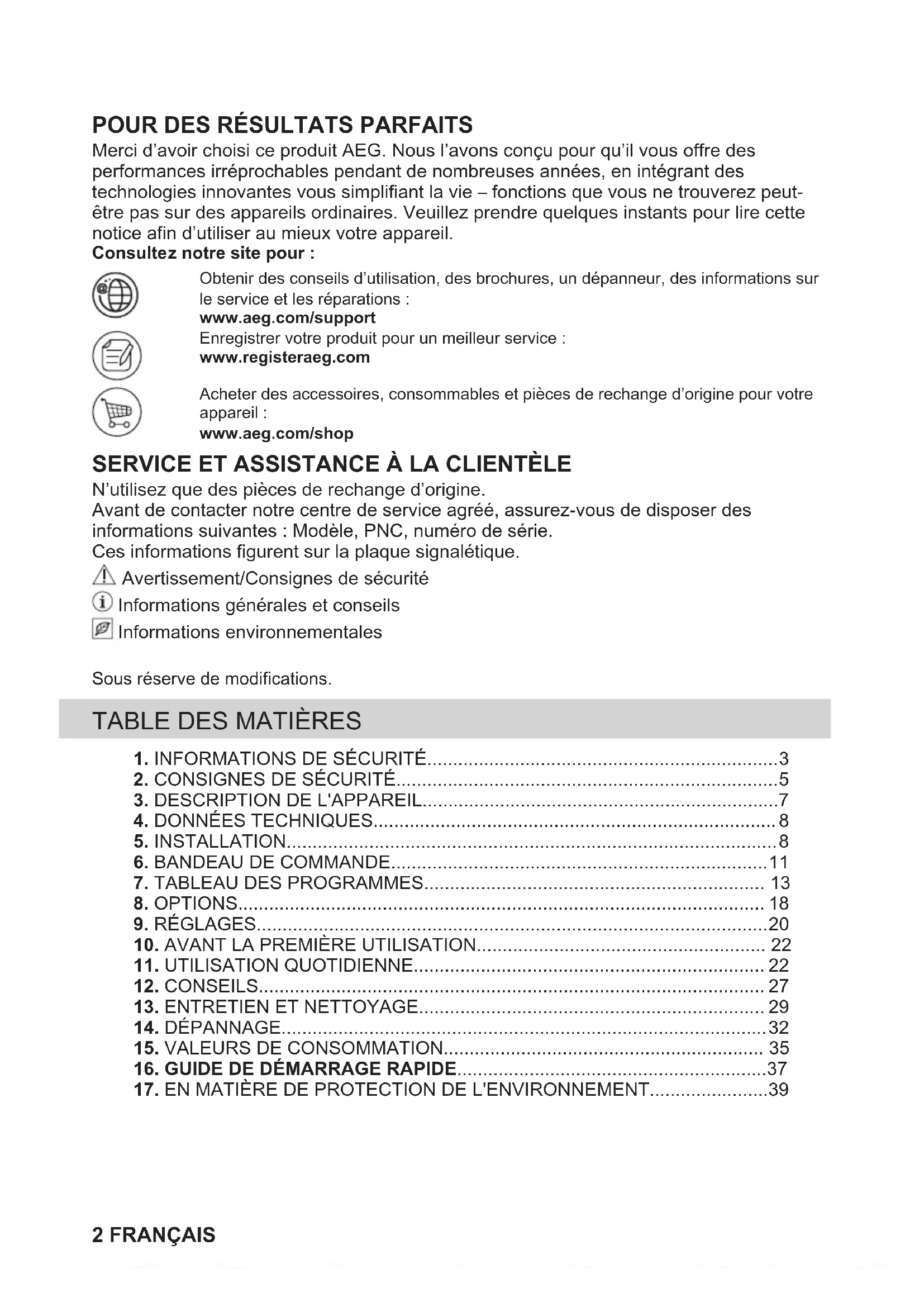 N’utilisez que des pièces de rechange d’origine. Avant de contacter notre centre de service agréé, assurez-vous de disposer des informations suivantes : Modèle, PNC, numéro de série. Ces informations figurent sur la plaque signalétique. Avertissement/Consignes de sécurité Informations générales et conseils Informations environnementales Sous réserve de modifications.