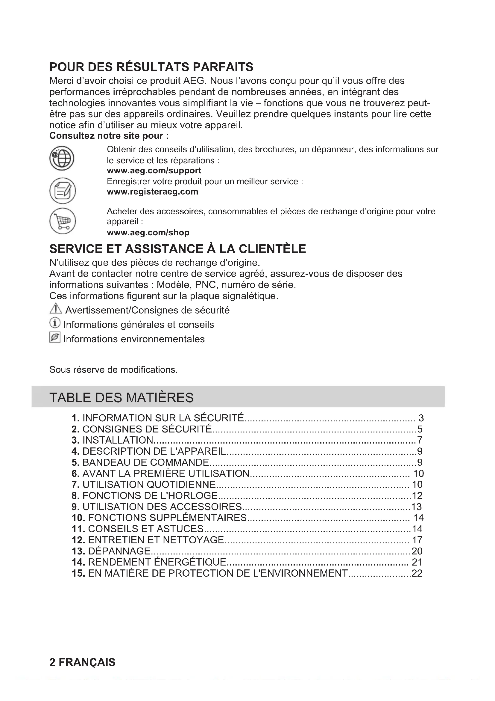 N’utilisez que des pièces de rechange d’origine. Avant de contacter notre centre de service agréé, assurez-vous de disposer des informations suivantes : Modèle, PNC, numéro de série. Ces informations figurent sur la plaque signalétique. Avertissement/Consignes de sécurité Informations générales et conseils Informations environnementales Sous réserve de modifications.
