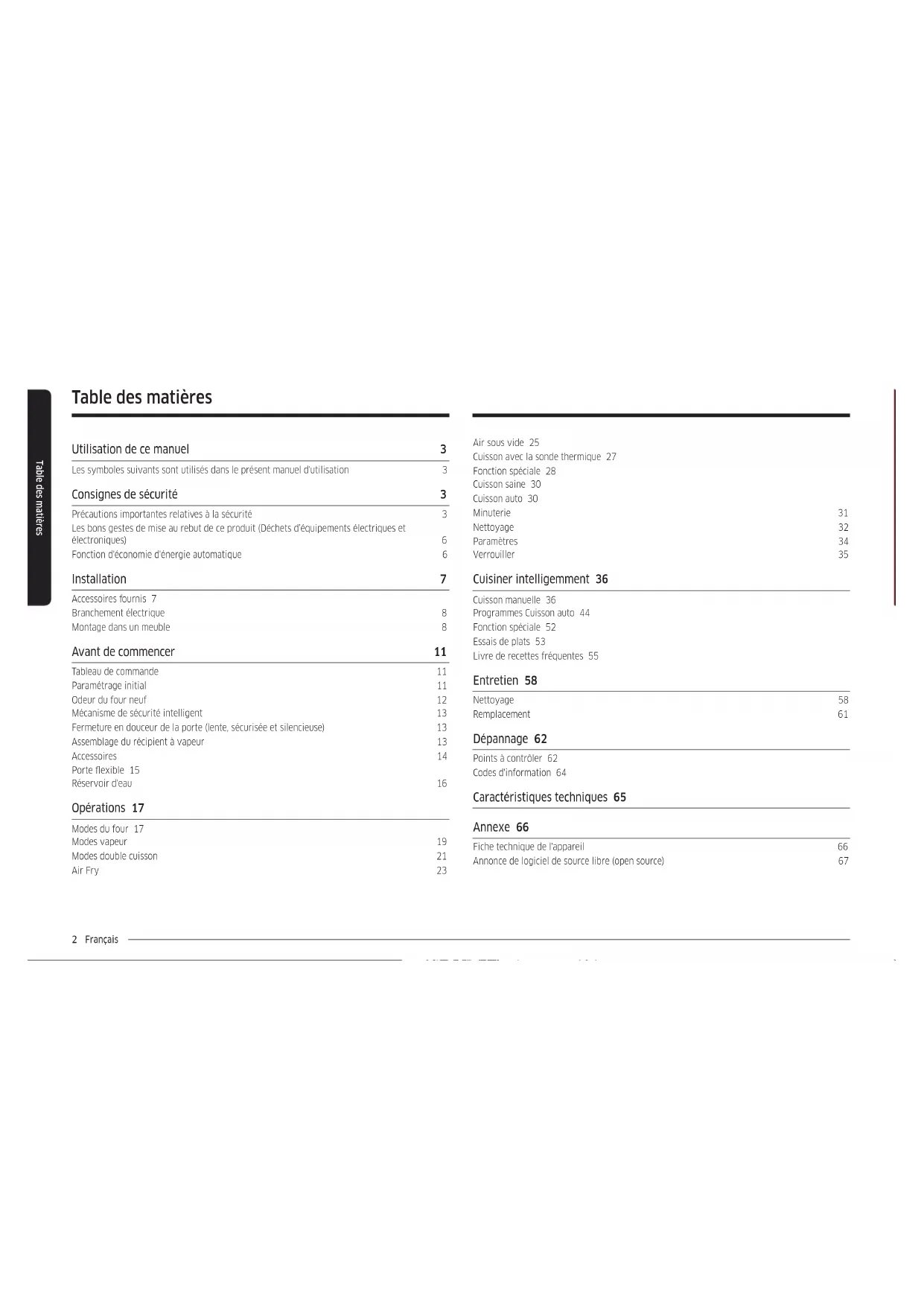 Fiche technique de l'appareil 66 Annonce de logiciel de source libre (open source) 67 Table des matières Utilisation de ce manuel 3 Les symboles suivants sont utilisés dans le présent manuel d'utilisation 3 Consignes de sécurité 3 Précautions importantes relatives à la sécurité 3 Les bons gestes de mise au rebut de ce produit (Déchets d’équipements électriques et électroniques) 6 Fonction d'économie d'énergie automatique 6 Installation 7 Accessoires fournis 7 Branchement électrique 8 Montage dans un meuble 8 Avant de commencer 11 Tableau de commande 11 Paramétrage initial 11 Odeur du four neuf 12 Mécanisme de sécurité intelligent 13 Fermeture en douceur de la porte (lente, sécurisée et silencieuse) 13 Assemblage du récipient à vapeur 13 Accessoires 14 Porte exible 15 Réservoir d'eau 16 Opérations 17 Modes du four 17 Modes vapeur 19 Modes double cuisson 21 Air Fry 23Français 3 Utilisation de ce manuel Consignes de sécurité L'installation de ce four doit être effectuée uniquement par un électricien qualié. Le technicien est chargé du branchement de l'appareil sur la prise d'alimentation conformément aux conseils de sécurité en vigueur. PRÉCAUTIONS IMPORTANTES RELATIVES À LA SÉCURITÉ AVERTISSEMENT Cet appareil n'est pas conçu pour être utilisé par des personnes (y compris les enfants) dont les capacités physiques, sensorielles ou mentales sont réduites, ou ayant une expérience et des connaissances insufsantes sur le sujet, sauf si celles-ci sont sous la surveillance de la personne responsable de leur sécurité ou si cette dernière leur a expliqué comment utiliser l'appareil. Les enfants doivent rester sous la surveillance d'un adulte an de s'assurer qu'ils ne jouent pas avec l'appareil. Le dispositif de sectionnement doit être intégré dans le câblage xe conformément aux règles de câblage. Cet appareil doit pouvoir être débranché de l'alimentation après installation. Pour que l'appareil puisse être facilement débranché une fois en place, veillez à ce que la prise murale reste accessible ou faites poser un interrupteur sur le câblage xe, conformément aux normes de câblage. Si le cordon d'alimentation est endommagé, il doit être remplacé par le fabricant, son réparateur agréé ou par toute personne de qualication similaire, an d'éviter tout danger. Utilisation de ce manuel Merci d'avoir choisi le four encastrable SAMSUNG.Ce manuel d'utilisation contient d'importantes informations relatives à la sécurité ainsi que les instructions de fonctionnement et d'entretien de l'appareil.Veuillez le lire très attentivement avant d'utiliser votre four et conservez-le précieusement en vue d'une consultation ultérieure. Les symboles suivants sont utilisés dans le présent manuel d'utilisation AVERTISSEMENT Risques ou manipulations dangereuses susceptibles d’entraîner des blessures graves, voire mortelles et/ou des dégâts matériels. ATTENTION Risques ou manipulations dangereuses susceptibles d’entraîner des blessures et/ou des dégâts matériels. REMARQUE Astuces utiles, conseils ou informations aidant les utilisateurs à manipuler l'appareil.4 Français Consignes de sécurité Consignes de sécurité Si le four est équipé d'une fonction de nettoyage, retirez tous les accessoires du four ainsi que les grosses projections des parois de l'appareil avant de lancer le nettoyage. La fonction de nettoyage dépend du modèle. Si le four est équipé d'une fonction de nettoyage, tenez les enfants éloignés de l'appareil pendant l'opération an d'éviter qu'ils ne se brûlent sur la porte. Pour les appareils utilisant le processus de nettoyage par pyrolyse, certains animaux (en particulier les oiseaux) peuvent être sensibles aux fumées et aux variations de température locale causées par le processus de nettoyage par pyrolyse. Pendant ce processus, l'appareil doit donc être déplacé dans un endroit approprié bien ventilé. Aérez la pièce pendant et après le processus de nettoyage par pyrolyse. La fonction de nettoyage dépend du modèle. Utilisez uniquement la sonde thermique recommandée pour ce four. (Modèle avec sonde thermique uniquement) Un nettoyeur vapeur ne doit pas être utilisé.