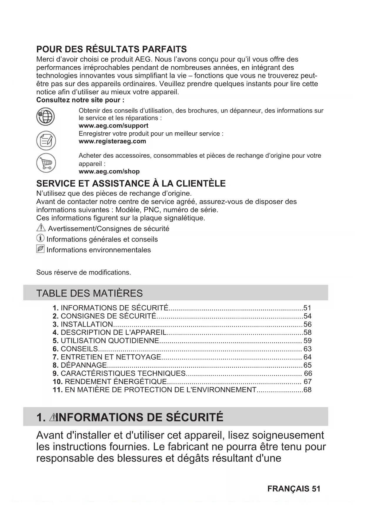 Merci d’avoir choisi ce produit AEG. Nous l’avons conçu pour qu’il vous offre desperformances irréprochables pendant de nombreuses années, en intégrant destechnologies innovantes vous simplifiant la vie – fonctions que vous ne trouverez peut-être pas sur des appareils ordinaires. Veuillez prendre quelques instants pour lire cettenotice afin d’utiliser au mieux votre appareil.Consultez notre site pour :Obtenir des conseils d’utilisation, des brochures, un dépanneur, des informations surle service et les réparations :www.aeg.com/supportEnregistrer votre produit pour un meilleur service :www.registeraeg.comAcheter des accessoires, consommables et pièces de rechange d’origine pour votreappareil :www.aeg.com/shop