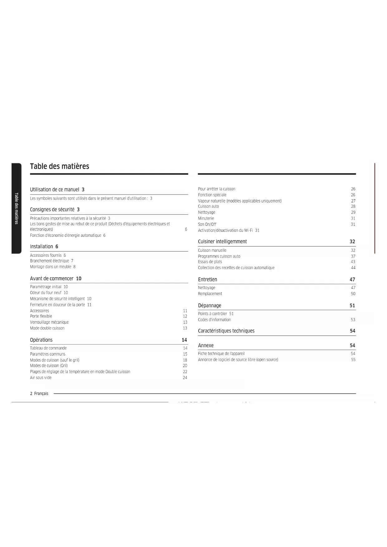 Four encastrable Manuel d'installation et d'utilisation NV7B441****/ NV7B442****/ NV7B443****/ NV7B444****/ NV7B445****/ NV7B441**C*/ NV7B442**C*/ NV7B444**C*/ NV7B451****/ NV7B452****/ NV7B453****/ NV7B454****/ NV7B455****2 Français Table des matières Table des matières Utilisation de ce manuel 3 Les symboles suivants sont utilisés dans le présent manuel d'utilisation : 3 Consignes de sécurité 3 Précautions importantes relatives à la sécurité 3 Les bons gestes de mise au rebut de ce produit (Déchets d’équipements électriques et électroniques) 6 Fonction d'économie d'énergie automatique 6 Installation 6 Accessoires fournis 6 Branchement électrique 7 Montage dans un meuble 8 Avant de commencer 10 Paramétrage initial 10 Odeur du four neuf 10 Mécanisme de sécurité intelligent 10 Fermeture en douceur de la porte 11 Accessoires 11 Porte exible 12 Verrouillage mécanique 13 Mode double cuisson 13 Opérations 14 Tableau de commande 14 Paramètres communs 15 Modes de cuisson (sauf le gril) 18 Modes de cuisson (Gril) 20 Plages de réglage de la température en mode Double cuisson 22 Air sous vide 24 Pour arrêter la cuisson 26 Fonction spéciale 26 Vapeur naturelle (modèles applicables uniquement) 27 Cuisson auto 28 Nettoyage 29 Minuterie 31 Son On/Off 31 Activation/désactivation du Wi-Fi 31 Cuisiner intelligemment 32 Cuisson manuelle 32 Programmes cuisson auto 37 Essais de plats 43 Collection des recettes de cuisson automatique 44 Entretien 47 Nettoyage 47 Remplacement 50 Dépannage 51 Points à contrôler 51 Codes d'information 53 Caractéristiques techniques 54